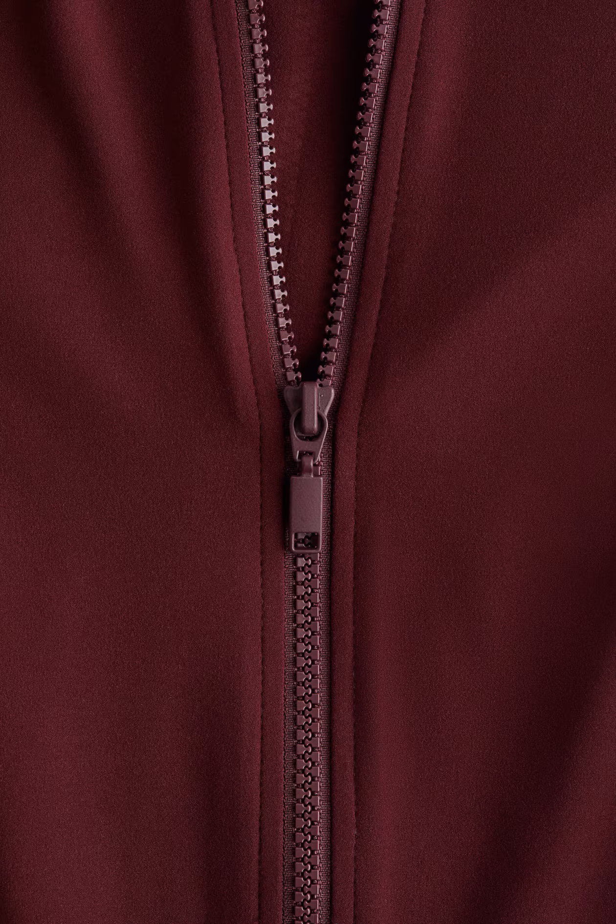 Fitted top in soft, stretch jersey with flatlock seams at front and back. Stand-up collar, zipper at front, and long sleeves.