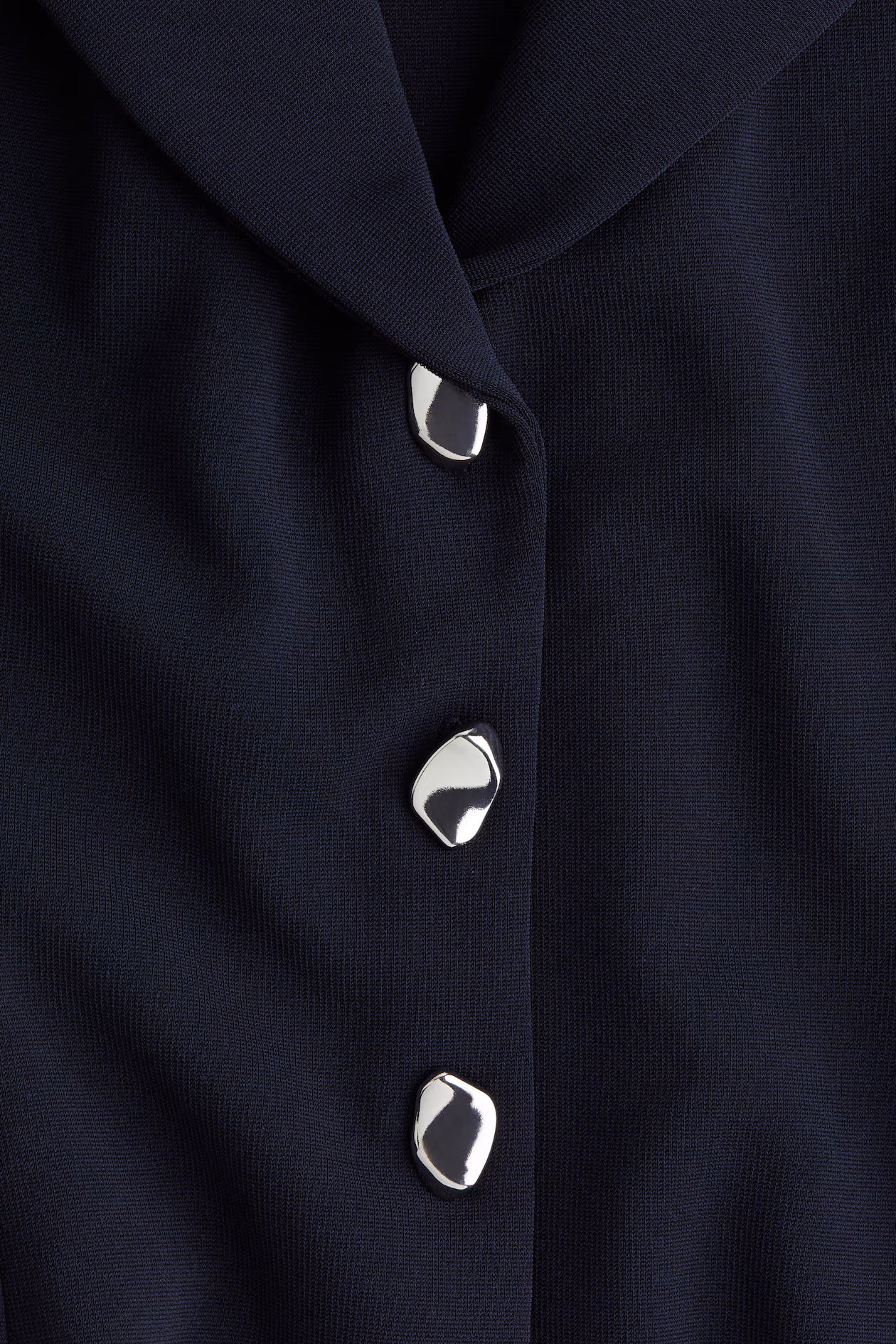 Fitted vest in thick interlock jersey. Notched lapels, irregular-shaped buttons at front, and shaping seams at waist.