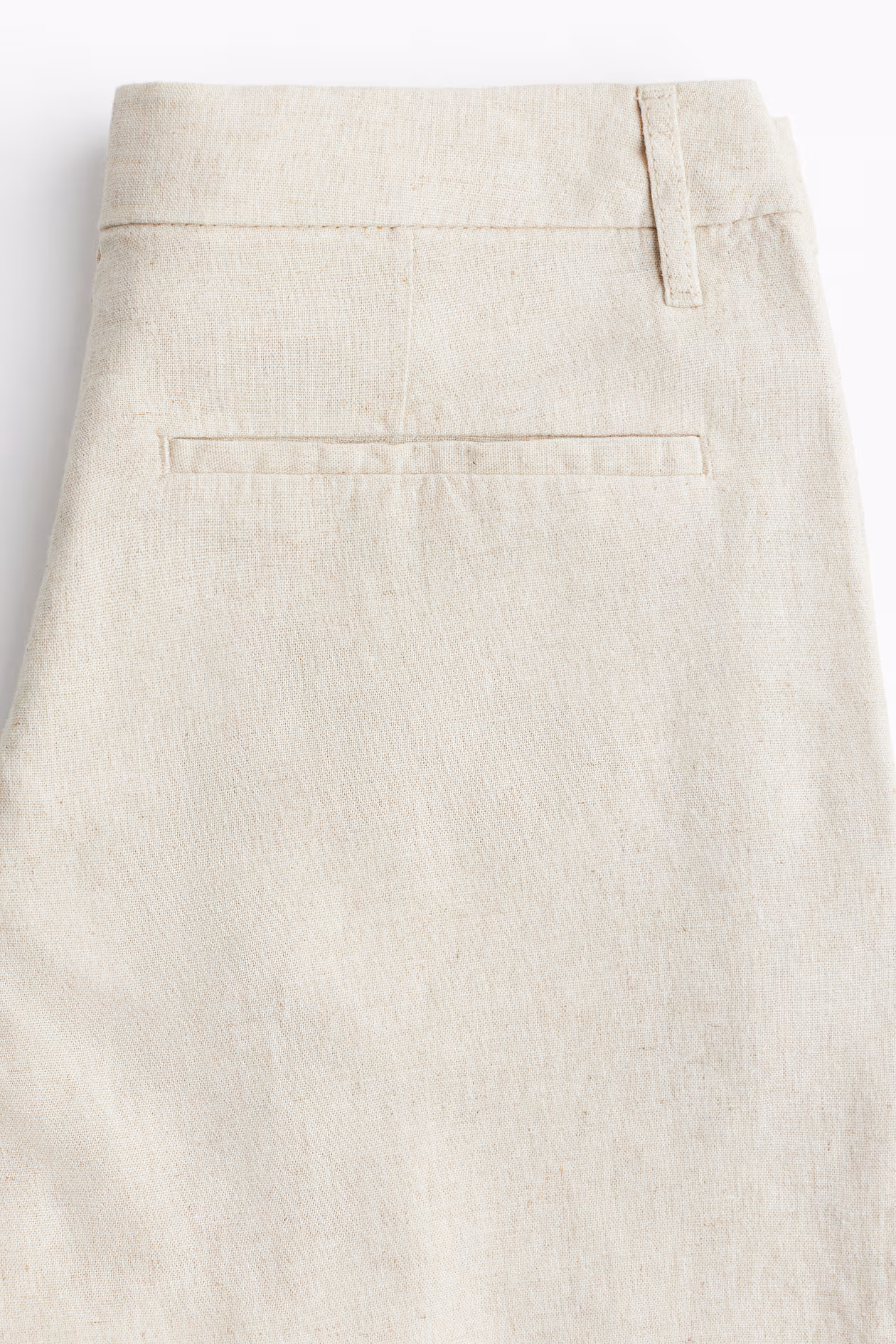 Loose-fit, knee-length shorts in an airy, woven linen and viscose blend. Extended waistband tab with a hook-and-bar fastener, pleats at front, and a zip fly. Diagonal side pockets and mock welt back pockets.
