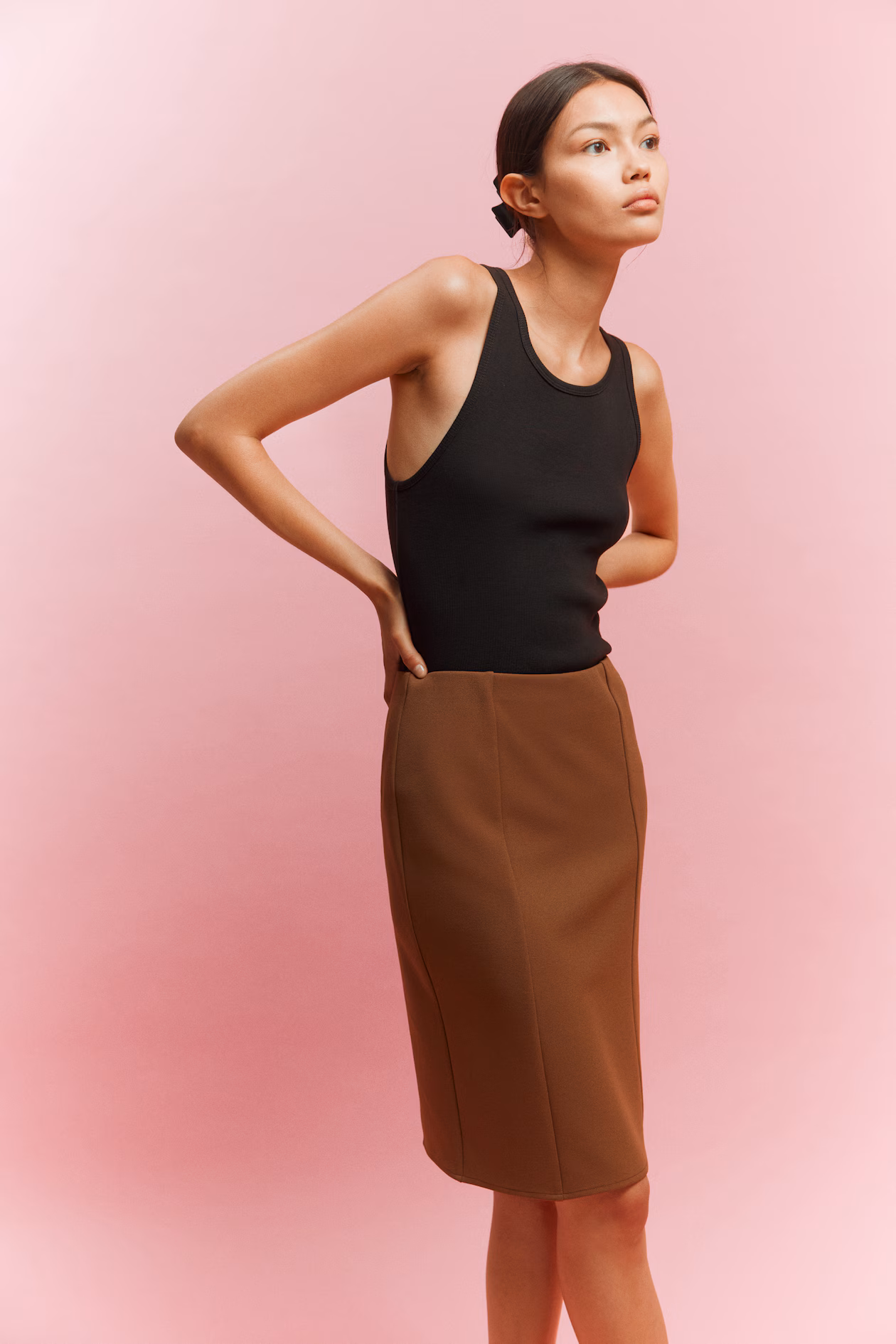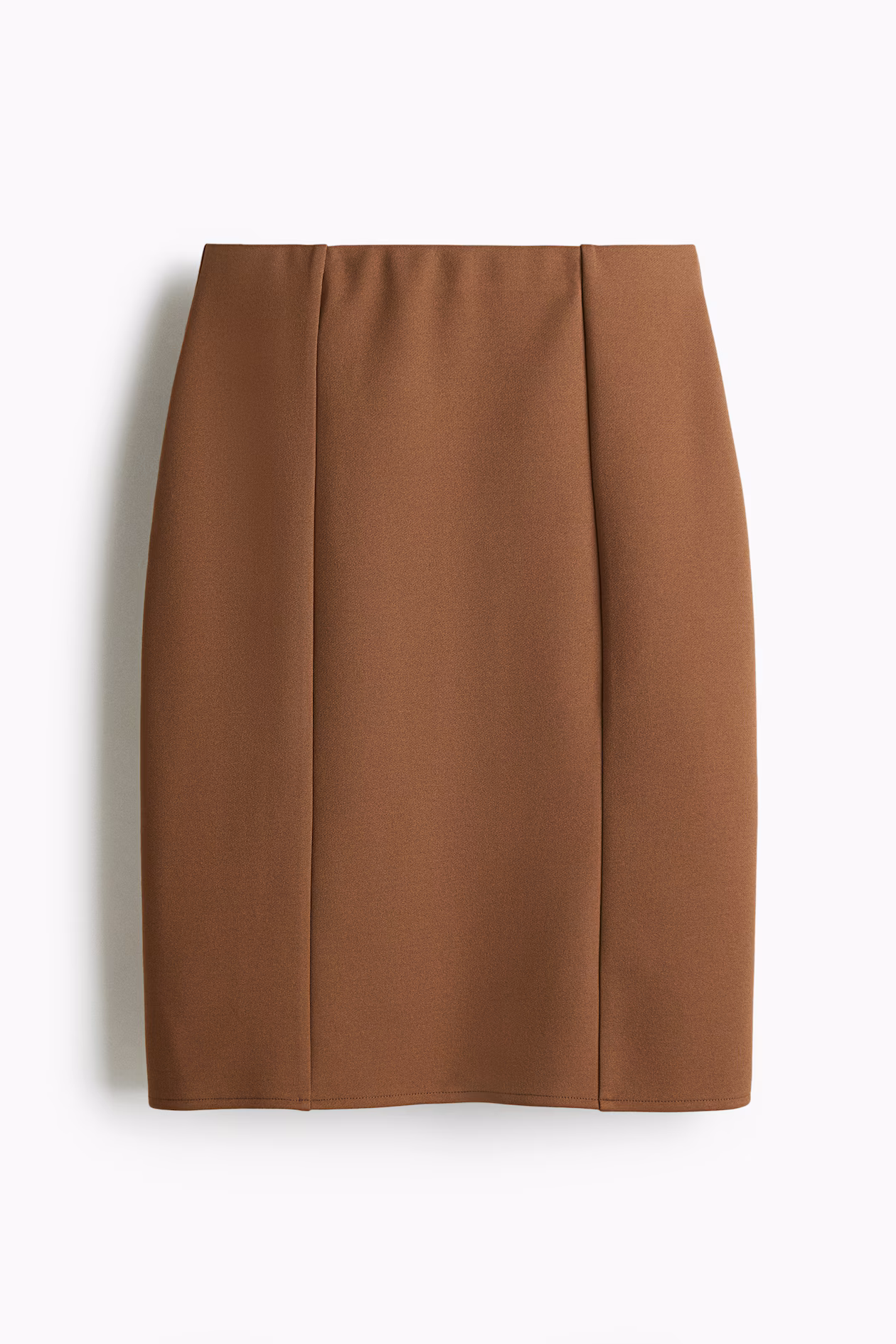 Fitted, knee-length skirt in jersey. High waist, concealed, elasticized waistband, and visible, vertical seams at front. Slit at back.
