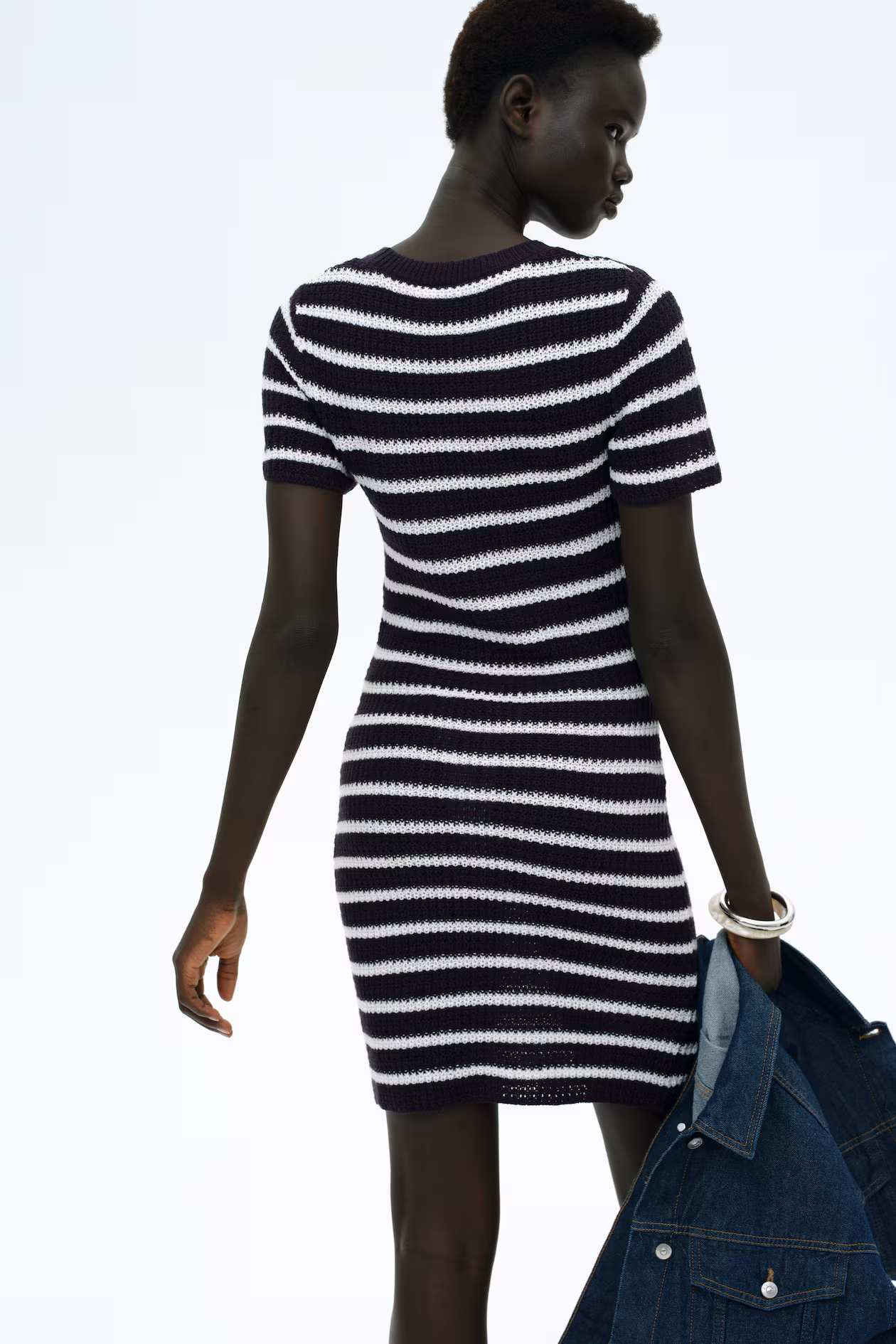 Short, fitted dress in a soft knit. Round, ribbed neckline, short sleeves, and straight hem.
