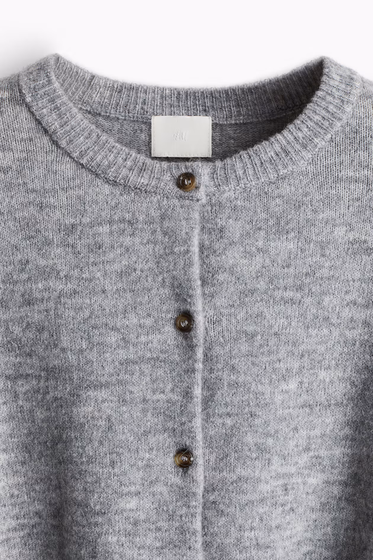 Soft, knit cardigan with wool content. Round neckline, buttons at front, and long sleeves. Ribbing at neckline, cuffs, and hem.