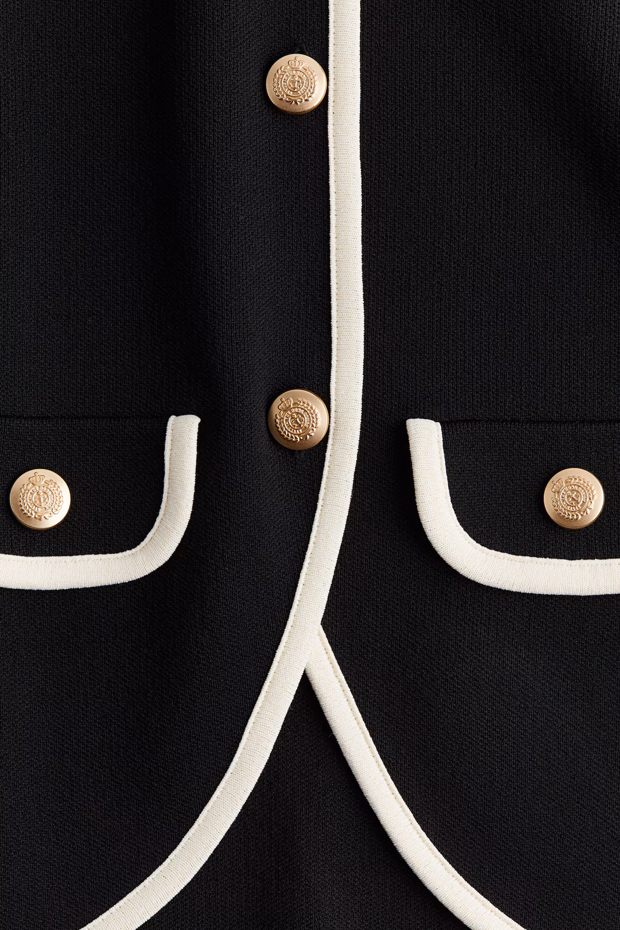 Fitted cardigan in densely knit fabric with contrasting trim. Round neckline, metal buttons at front with a motif, and long sleeves. Decorative pocket flaps on chest and at front.