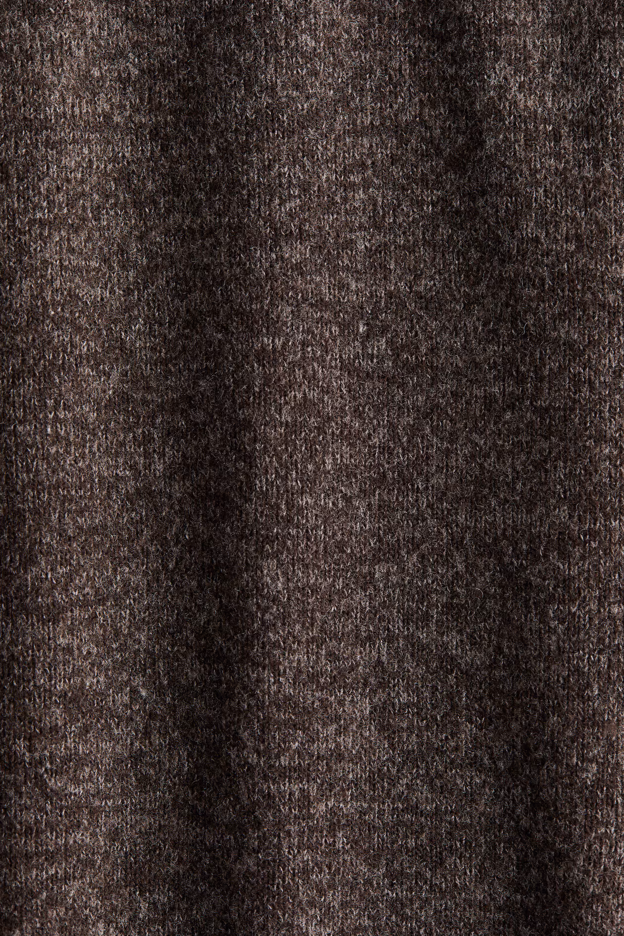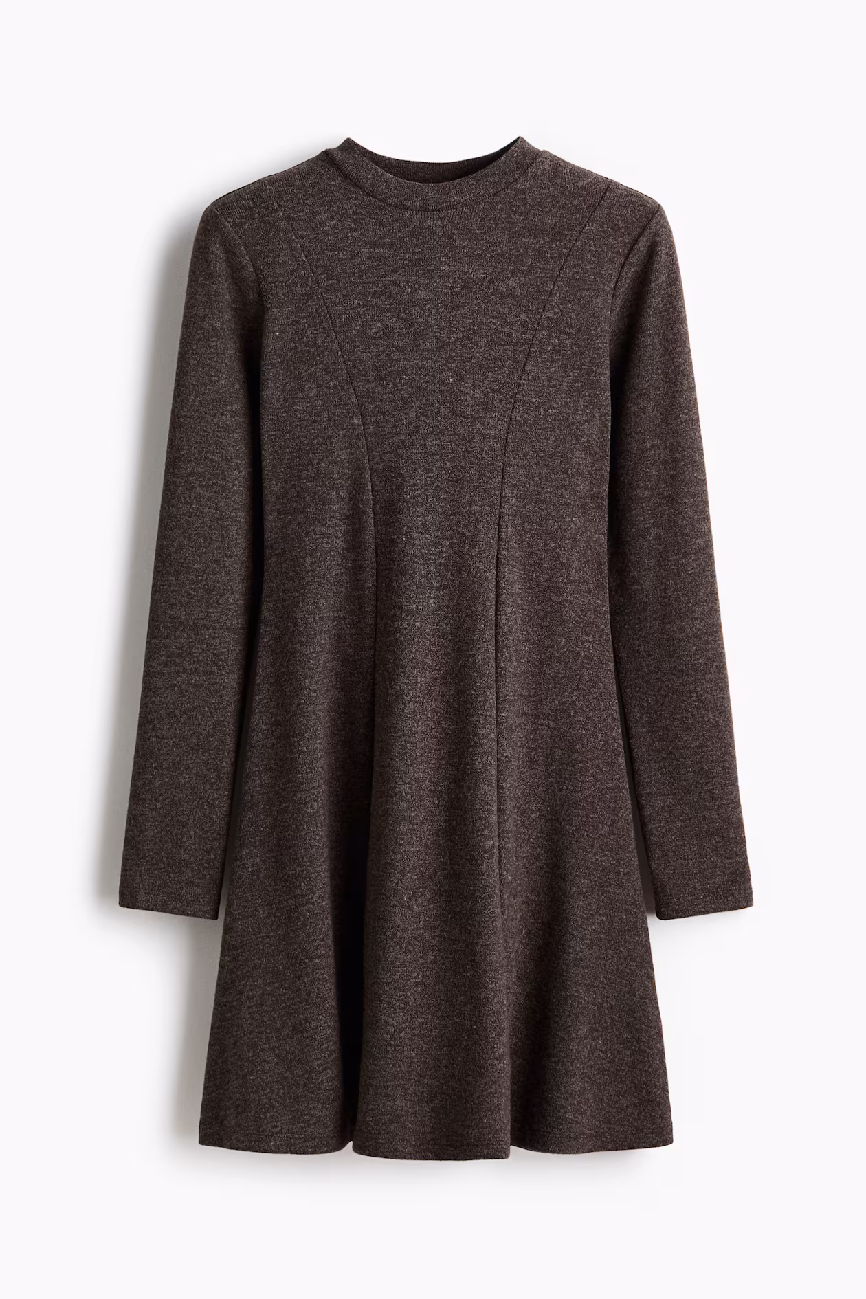 Long-sleeved mini dress in a soft, fine knit with visible, vertical seams at front. Round neckline, shaping darts at back, and a flared skirt.