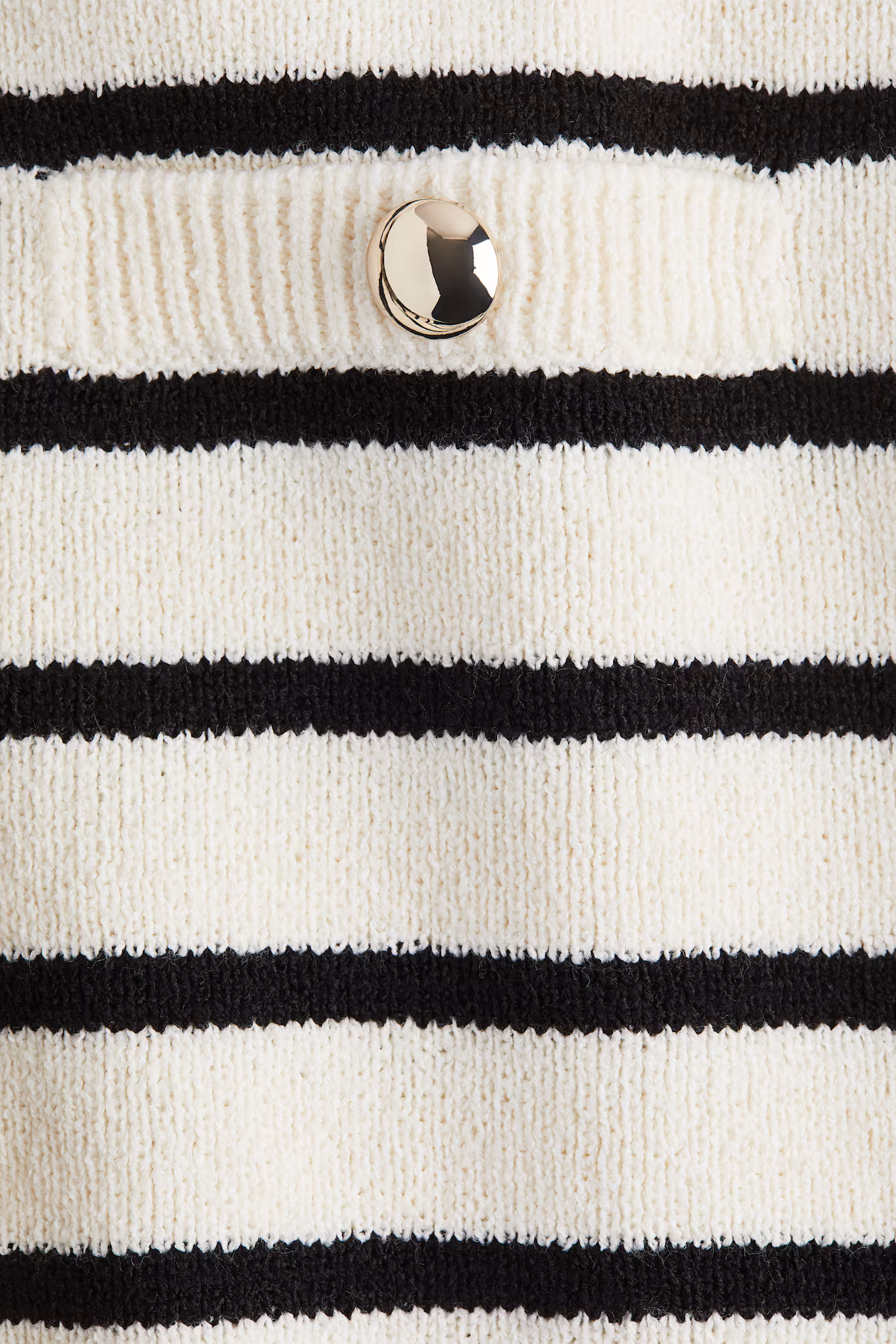 Fitted mini shorts in a soft knit. High waist, elasticized waistband, and mock front pockets with a gold-colored metal button.
