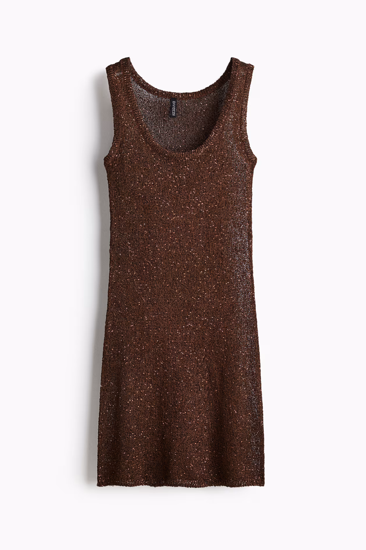 Short, fitted, sleeveless dress in an airy knit with shimmery sequins. Round neckline.