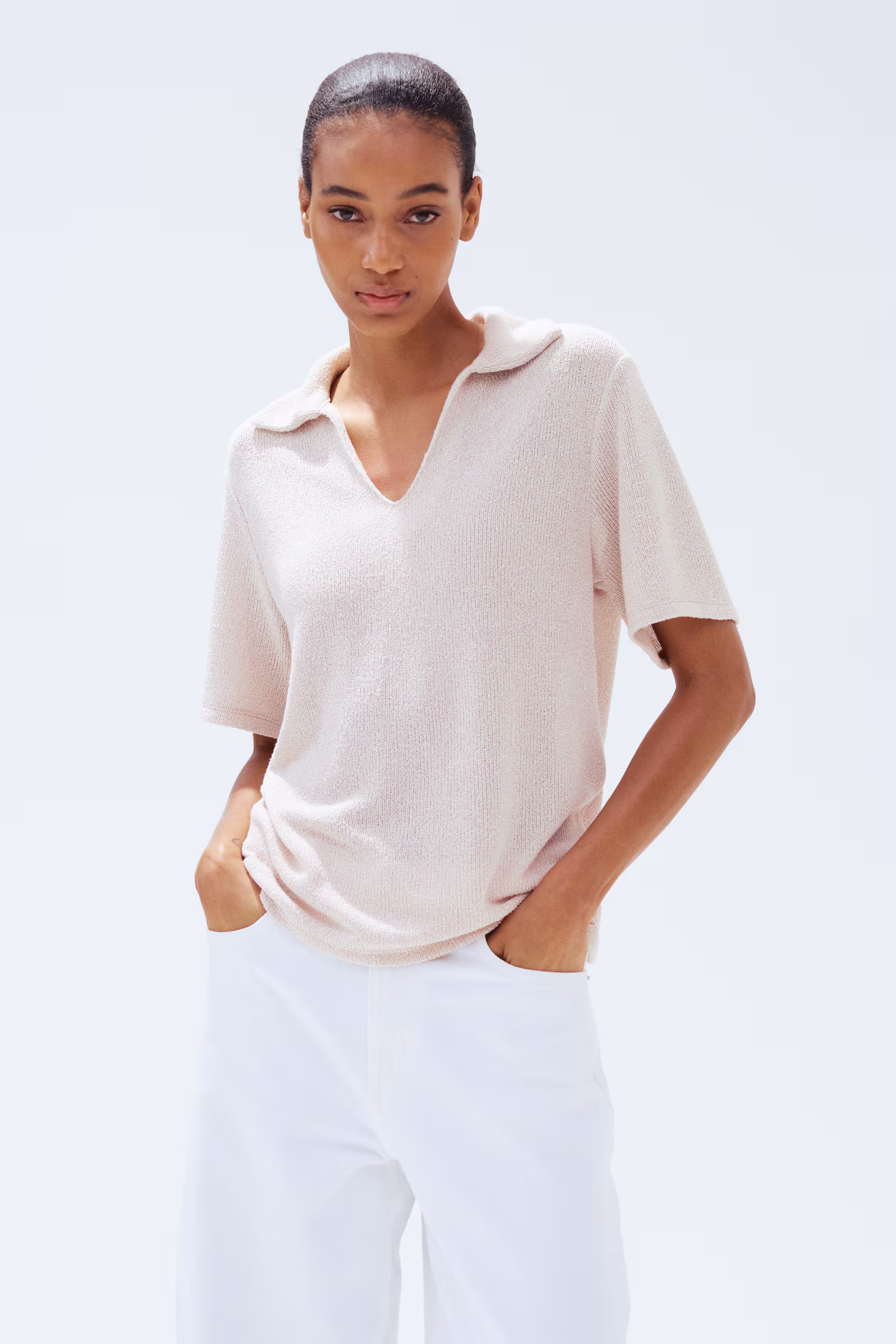 Loose-fit knit top. Open collar, gently dropped shoulders, and short sleeves.