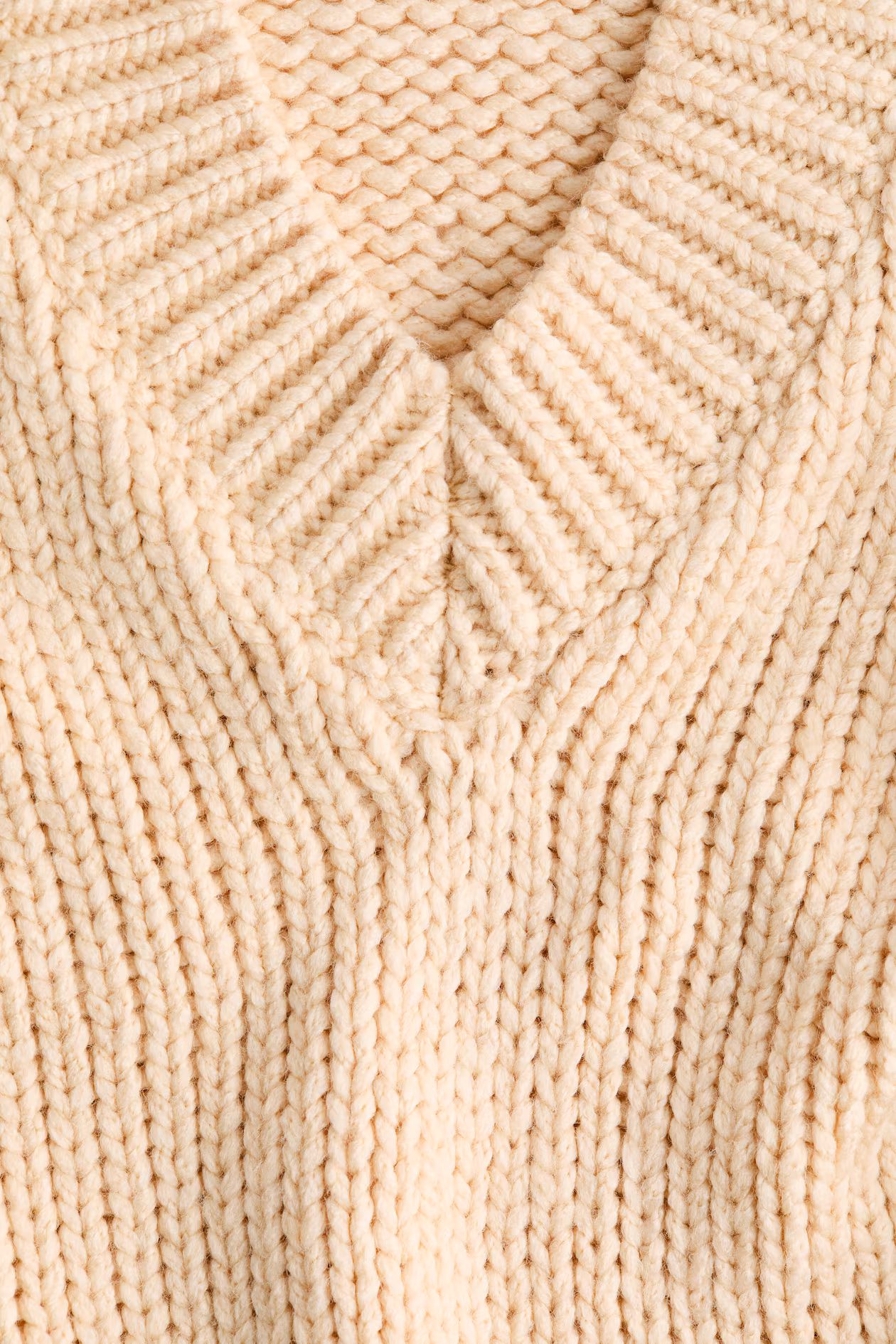 Chunky-knit sweater with wool content. V-neck, dropped shoulders, and long sleeves. Ribbing at neck, cuffs, and hem.