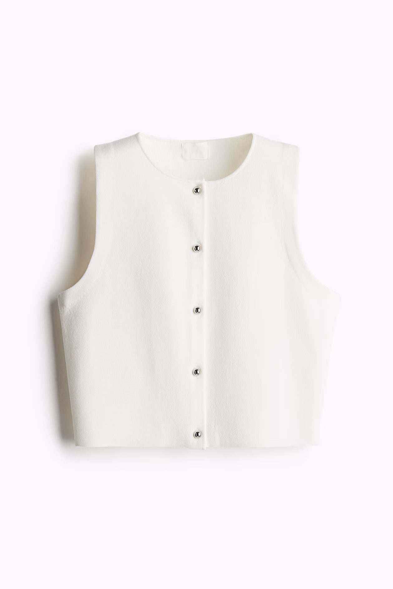 Short, fitted vest in densely knit fabric. Round neckline and metal buttons at front.