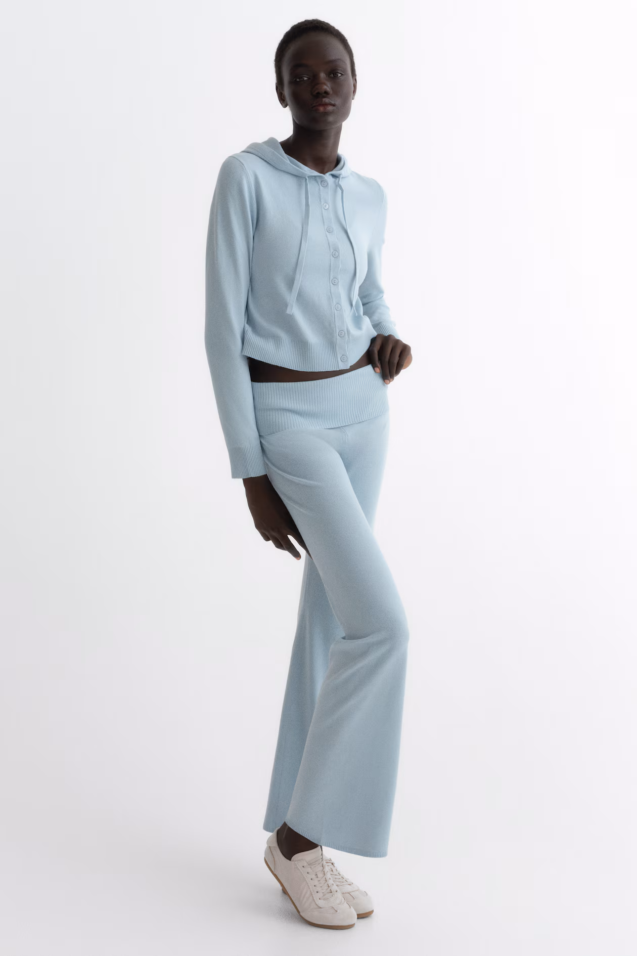 Yoga pants in a soft knit with a regular waist. Concealed elastic and a wide, rib-knit foldover at waistband. Gently flared legs.
