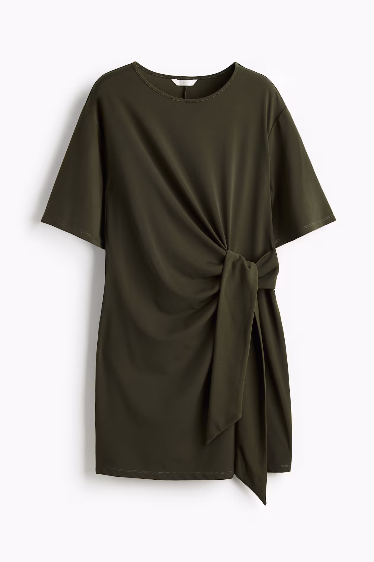 Short dress in jersey. Round neckline, short sleeves, and a flattering knot detail at one side for a tapered waist.