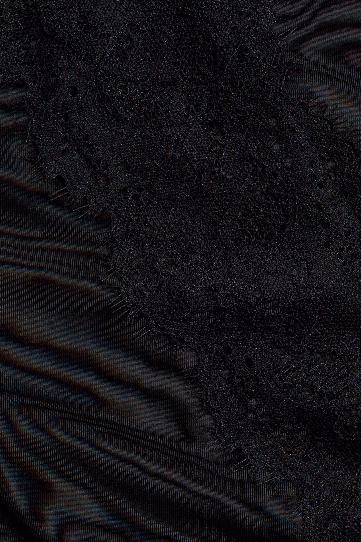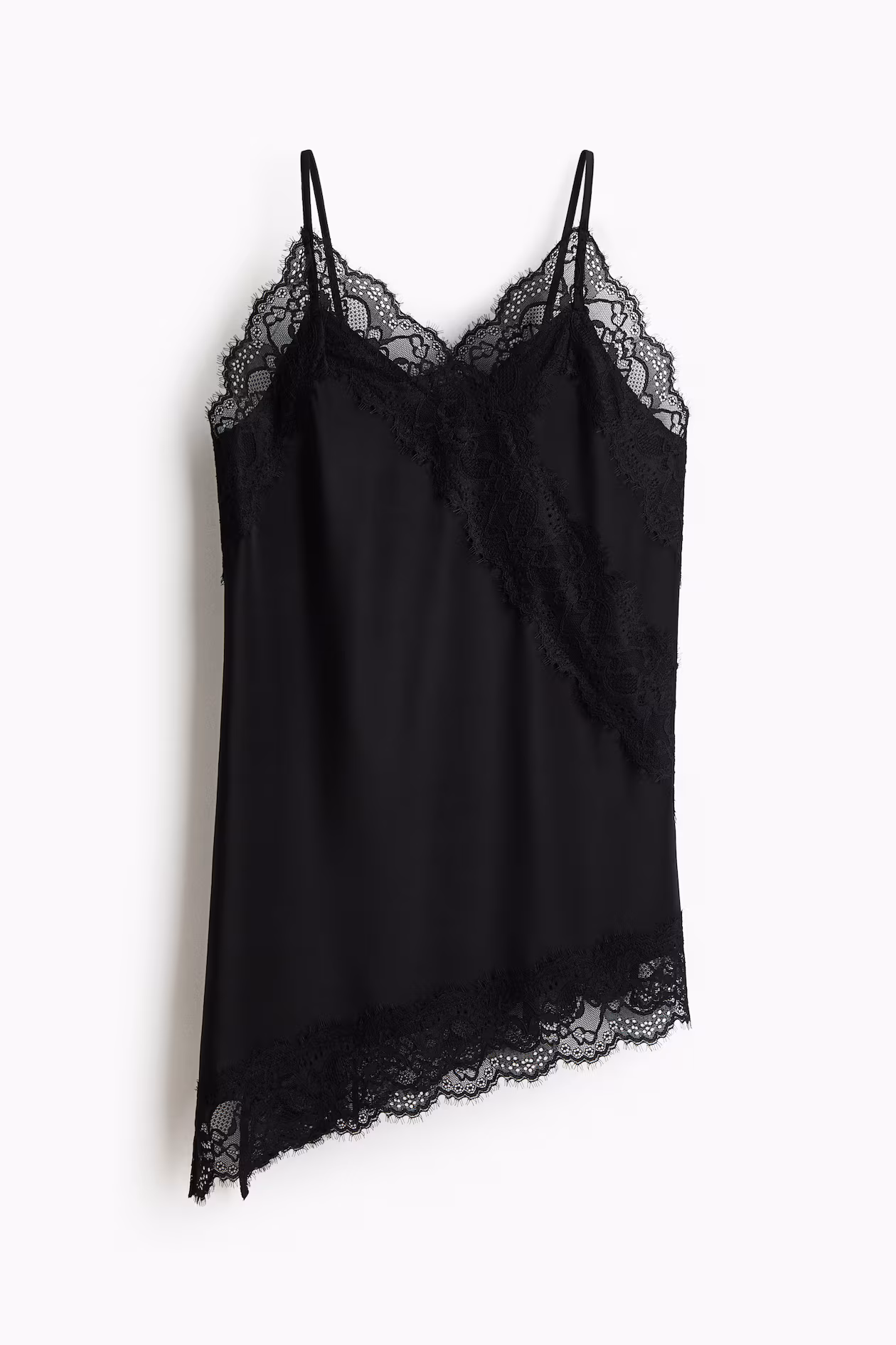 Sleeveless top in soft jersey with delicate lace trim at upper edge and hem. Narrow shoulder straps, V-neck, and a diagonal lace inset below one side of bust. Asymmetric hem.