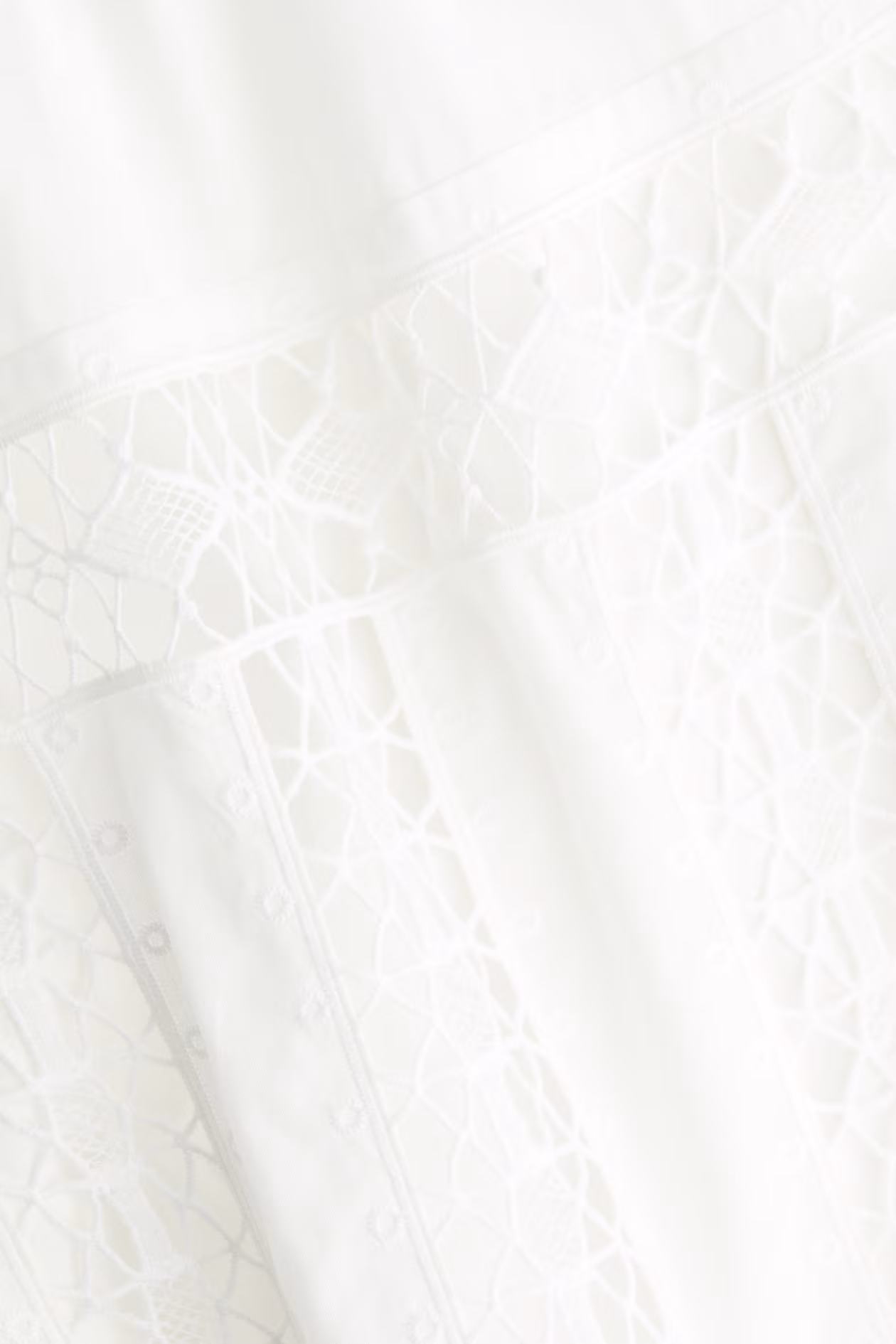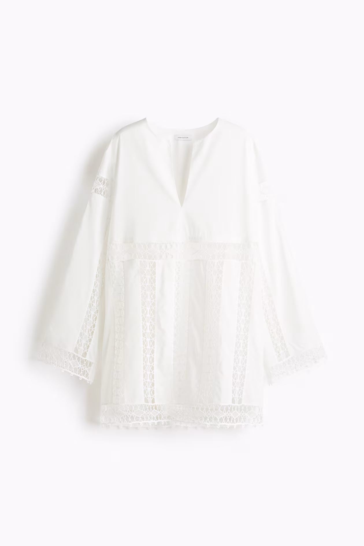 Short dress in airy woven cotton with lace insets. Round neckline, V-shaped opening at front, and long sleeves. Picot-trimmed cuffs and hem. Unlined.