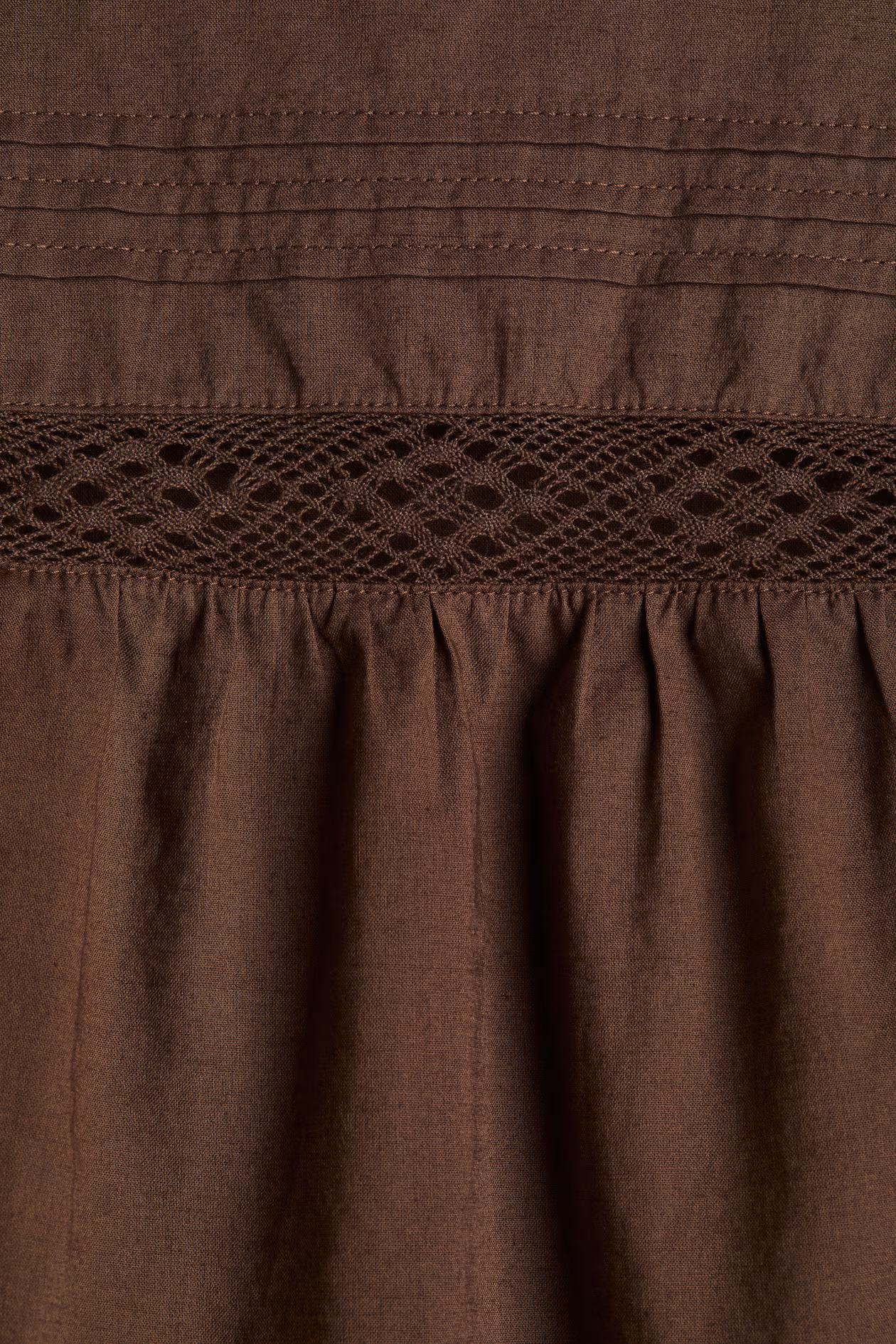 Blouse in soft woven cotton with lace insets and pintucks. Round neckline, keyhole opening at back with button, flutter sleeves, and a flared peplum.