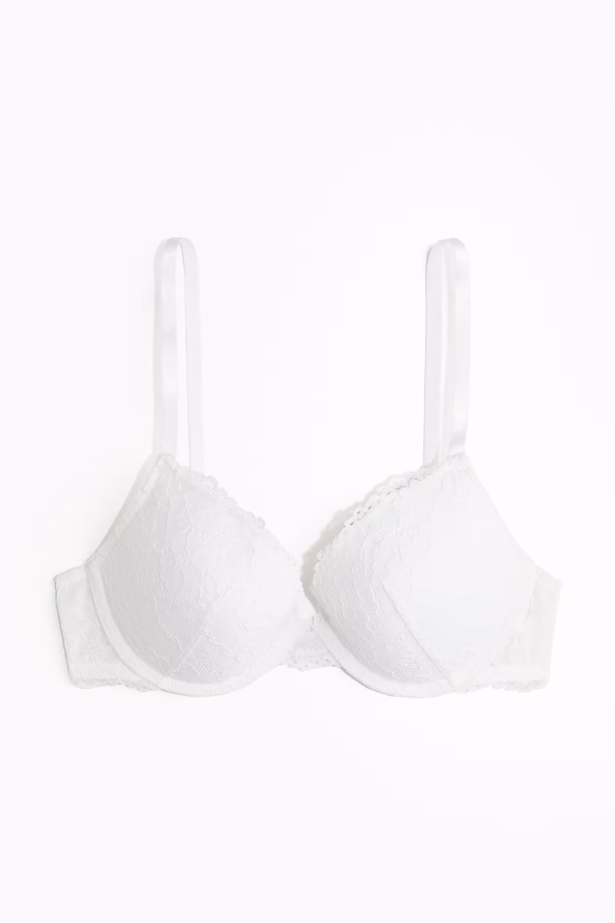 Push-up bra in lace. Adjustable shoulder straps, padded, underwire cups to maximize bust and cleavage, and hook-and-eye fasteners at back.