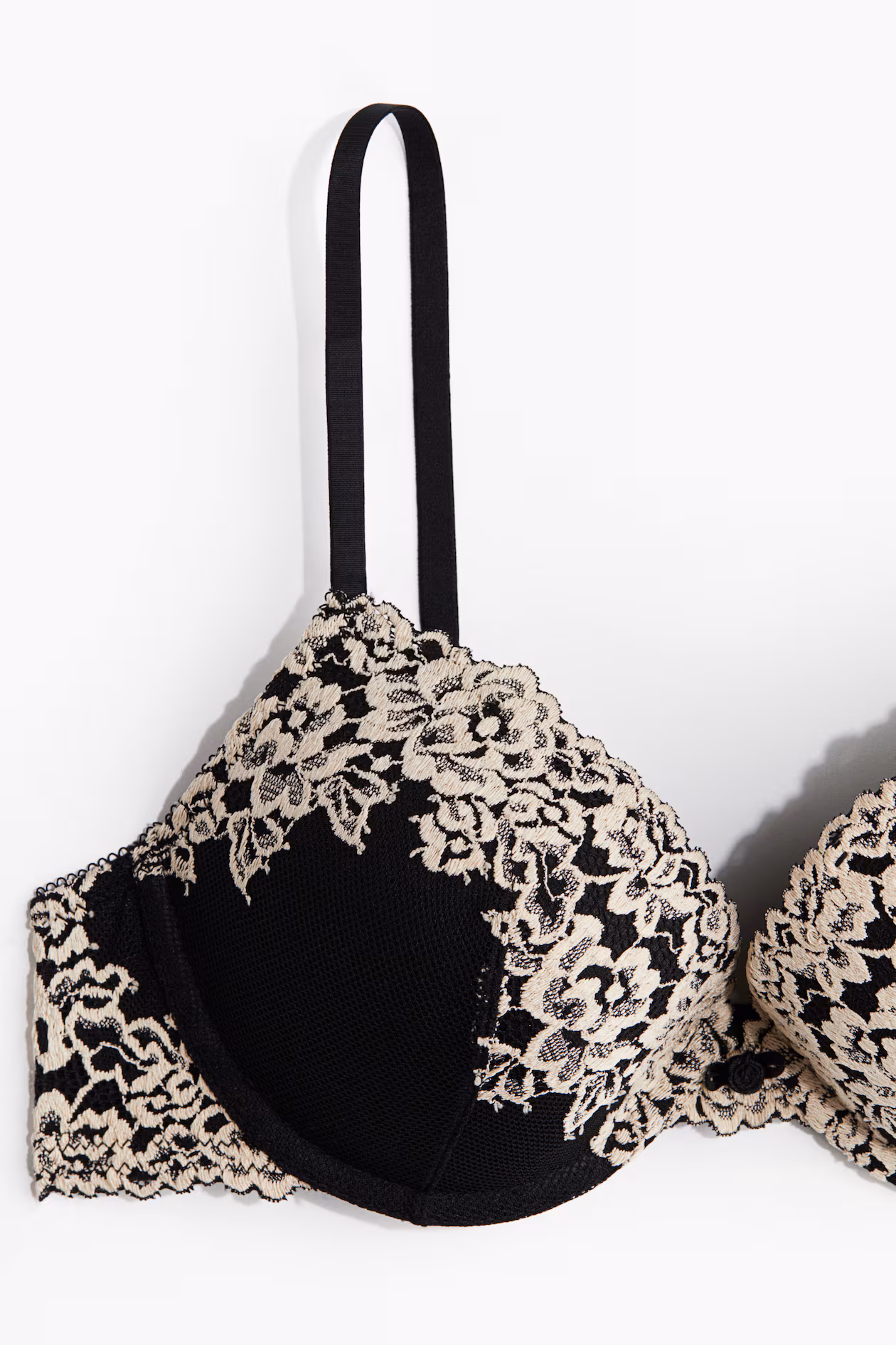 Push-up bra in mesh and lace. Adjustable shoulder straps, padded, underwire cups to maximize bust and cleavage, and hook-and-eye fasteners at back.