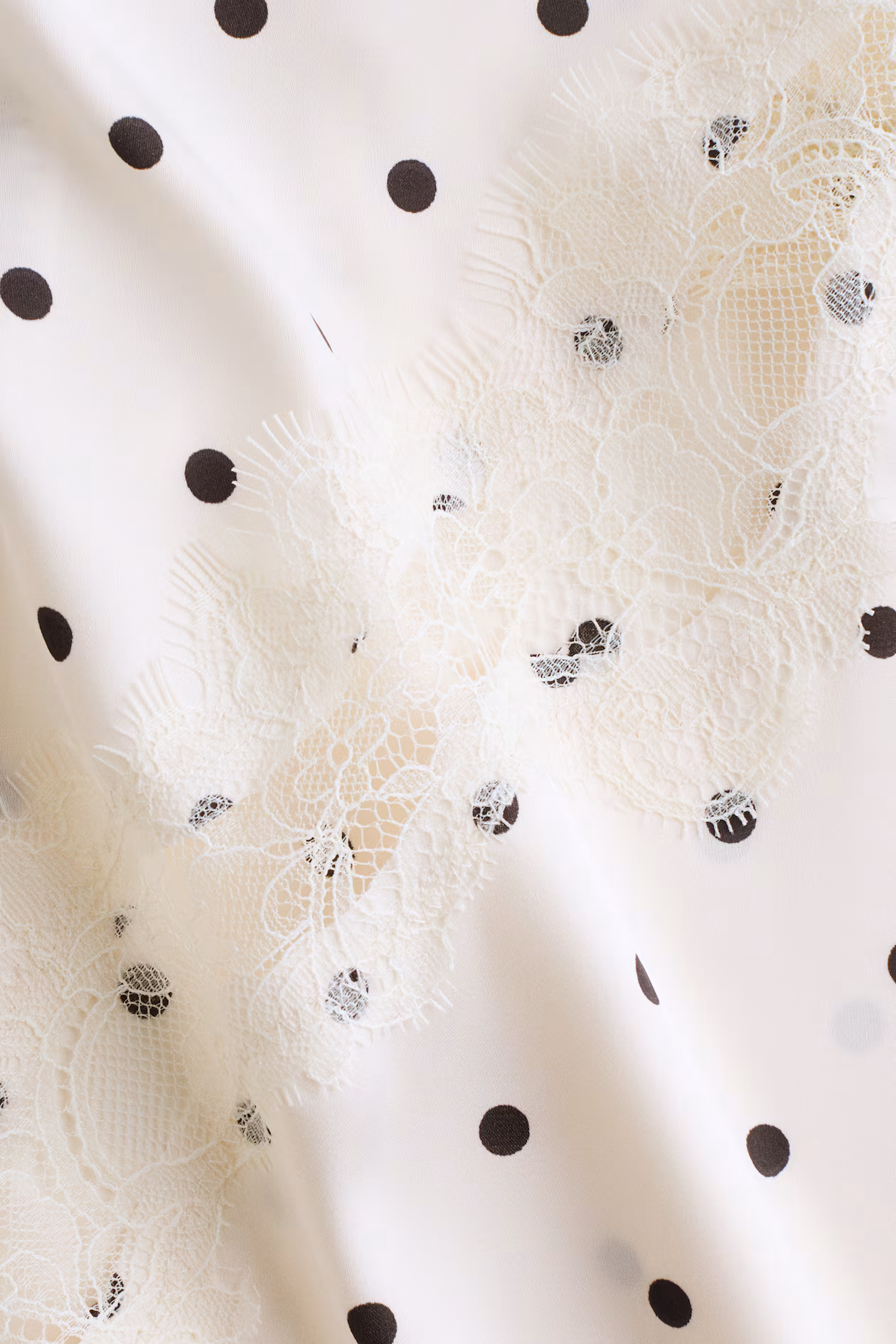 Short nightgown in softly draped satin with lace-trimmed edges. Adjustable, extra-narrow shoulder straps, low-cut V-neck at front and back, and an asymmetric hem.