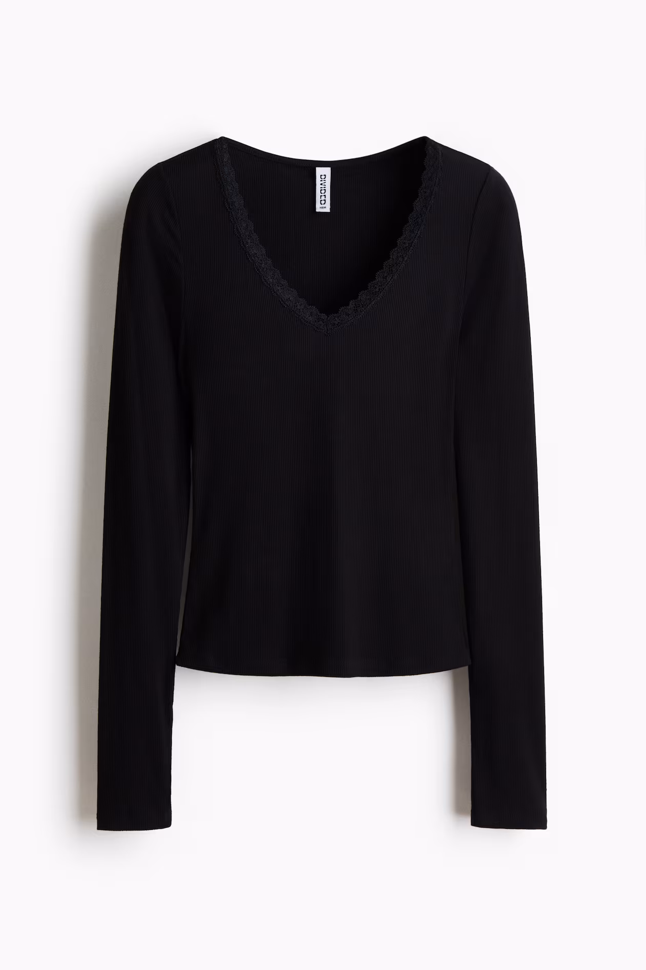 Fitted, long-sleeved top in ribbed jersey with a lace-trimmed V-neck.