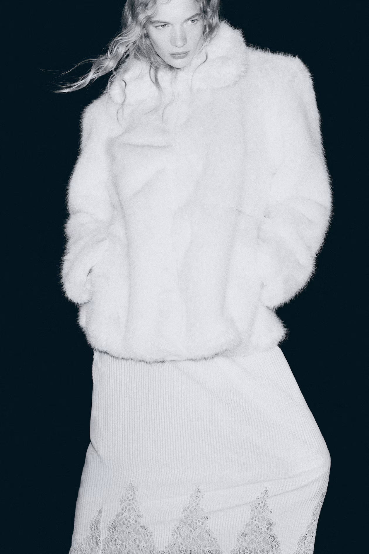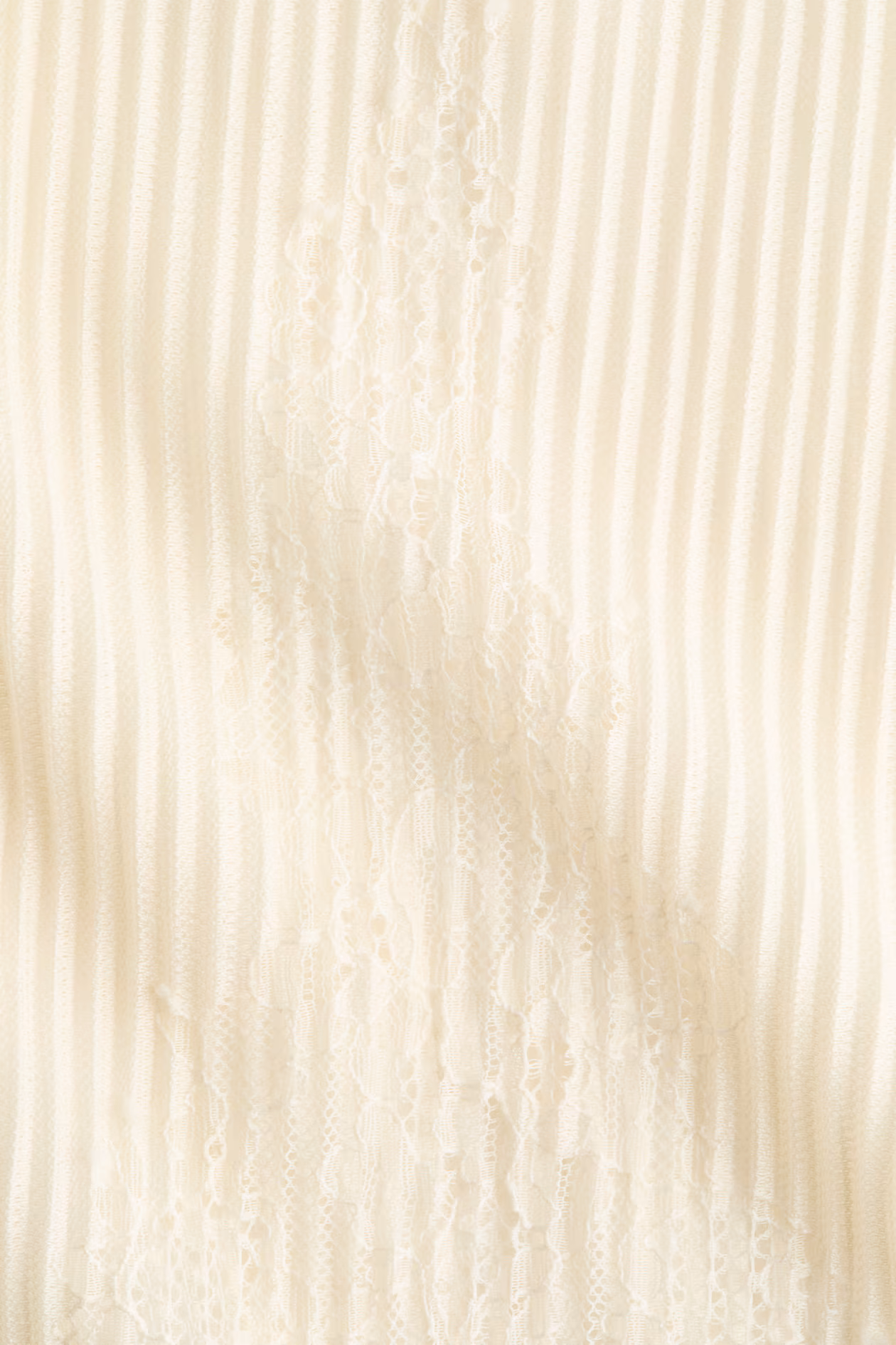 Calf-length skirt in finely pleated jersey. High waist, elasticized waistband, and a lace-trimmed hem.