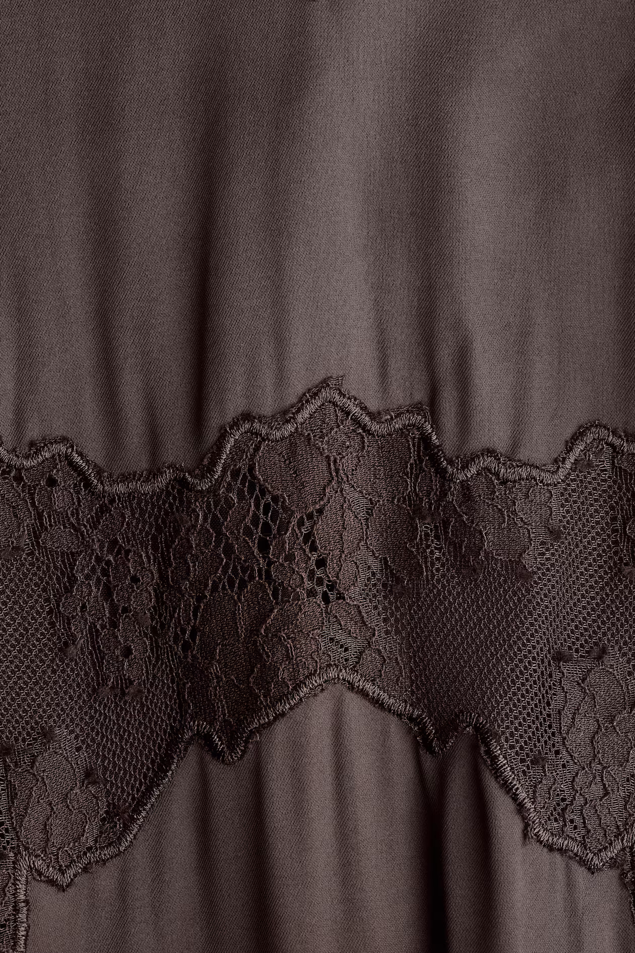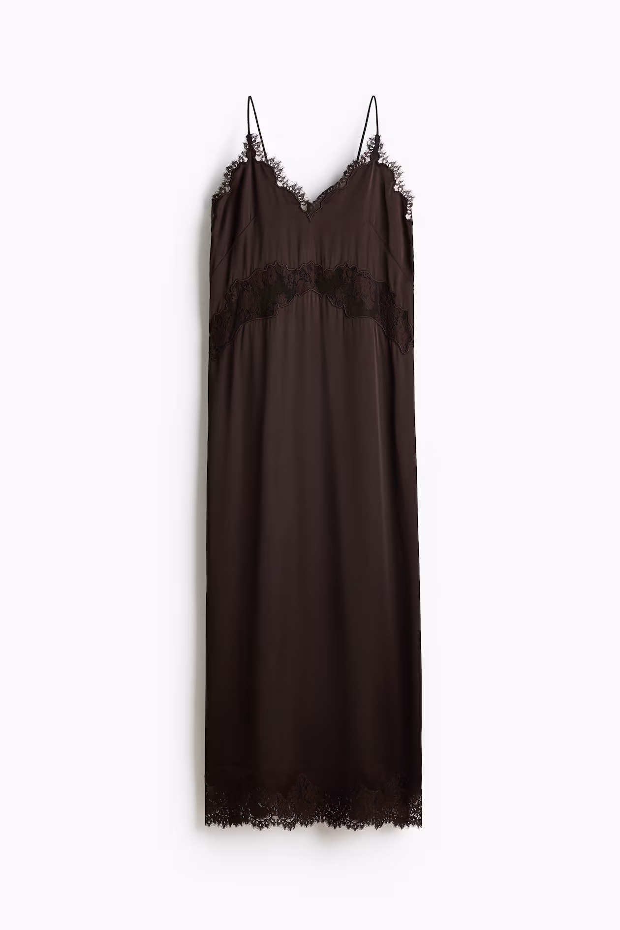 Long, fitted dress in softly draped satin. Adjustable, extra-narrow shoulder straps, V-neck with delicate lace trim, and a wide lace inset below bust. Concealed zipper at back. Unlined.