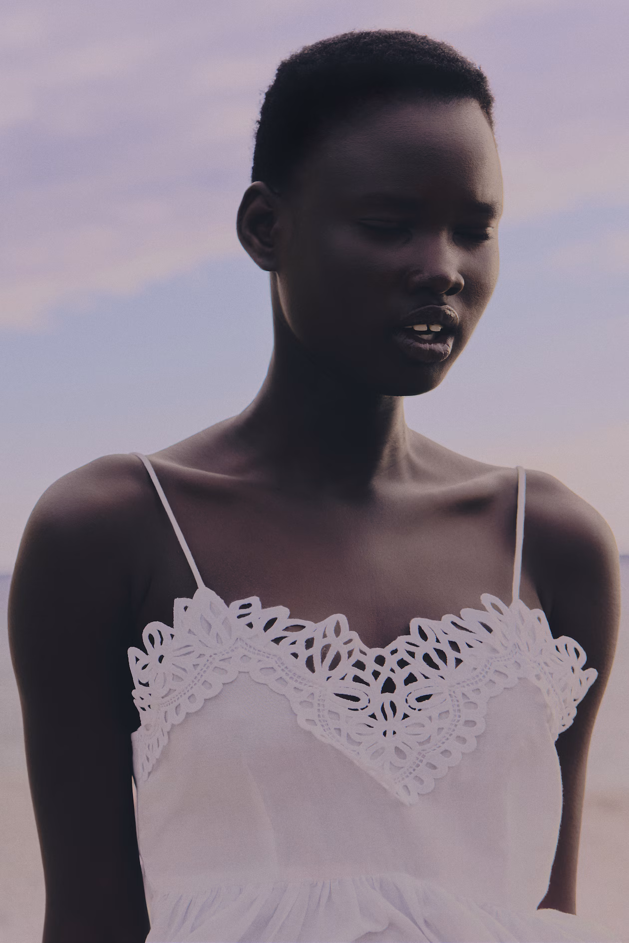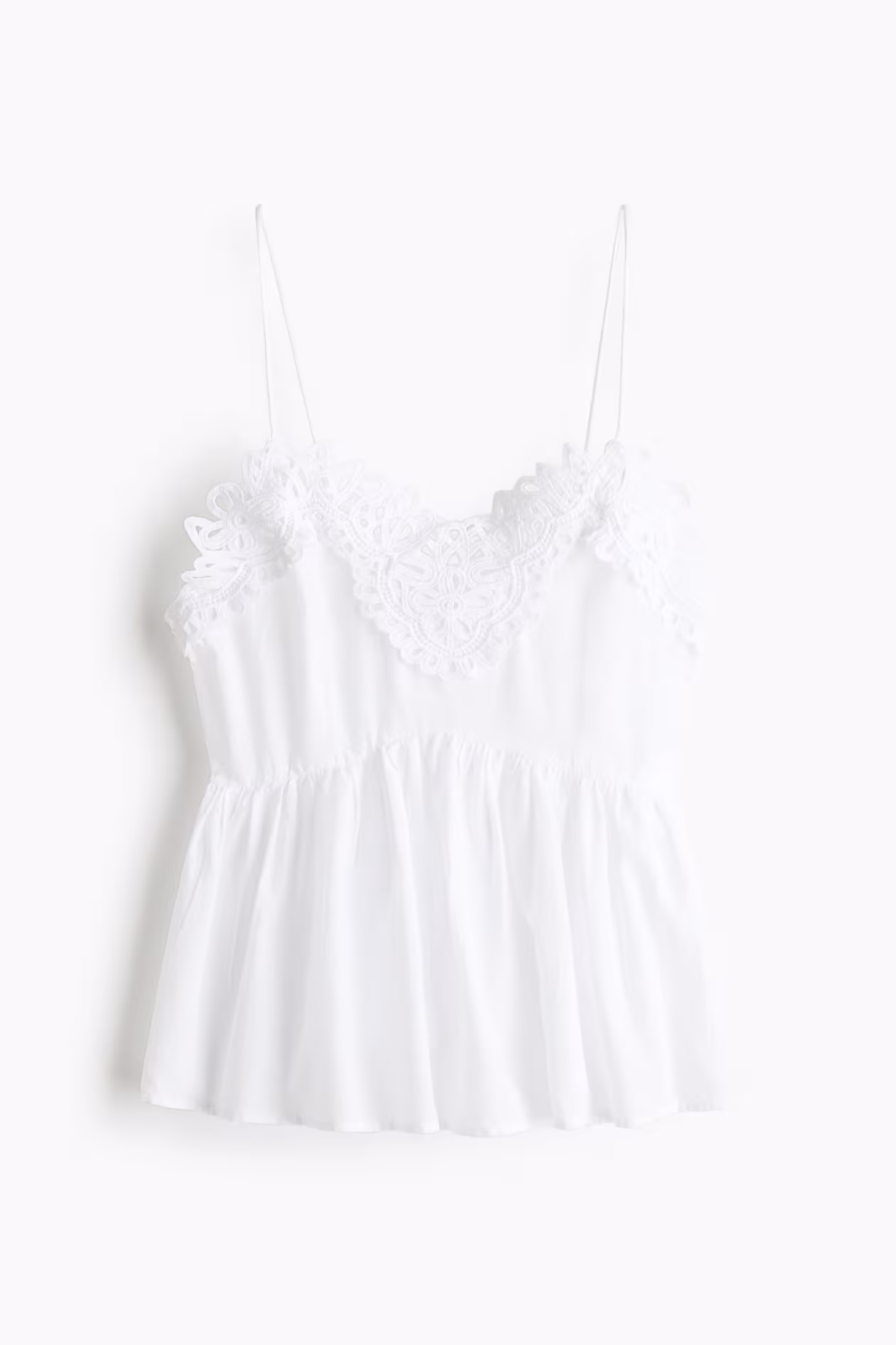Top in woven cotton with wide lace trim at top. Extra-narrow shoulder straps and a gathered seam below bust for added volume.