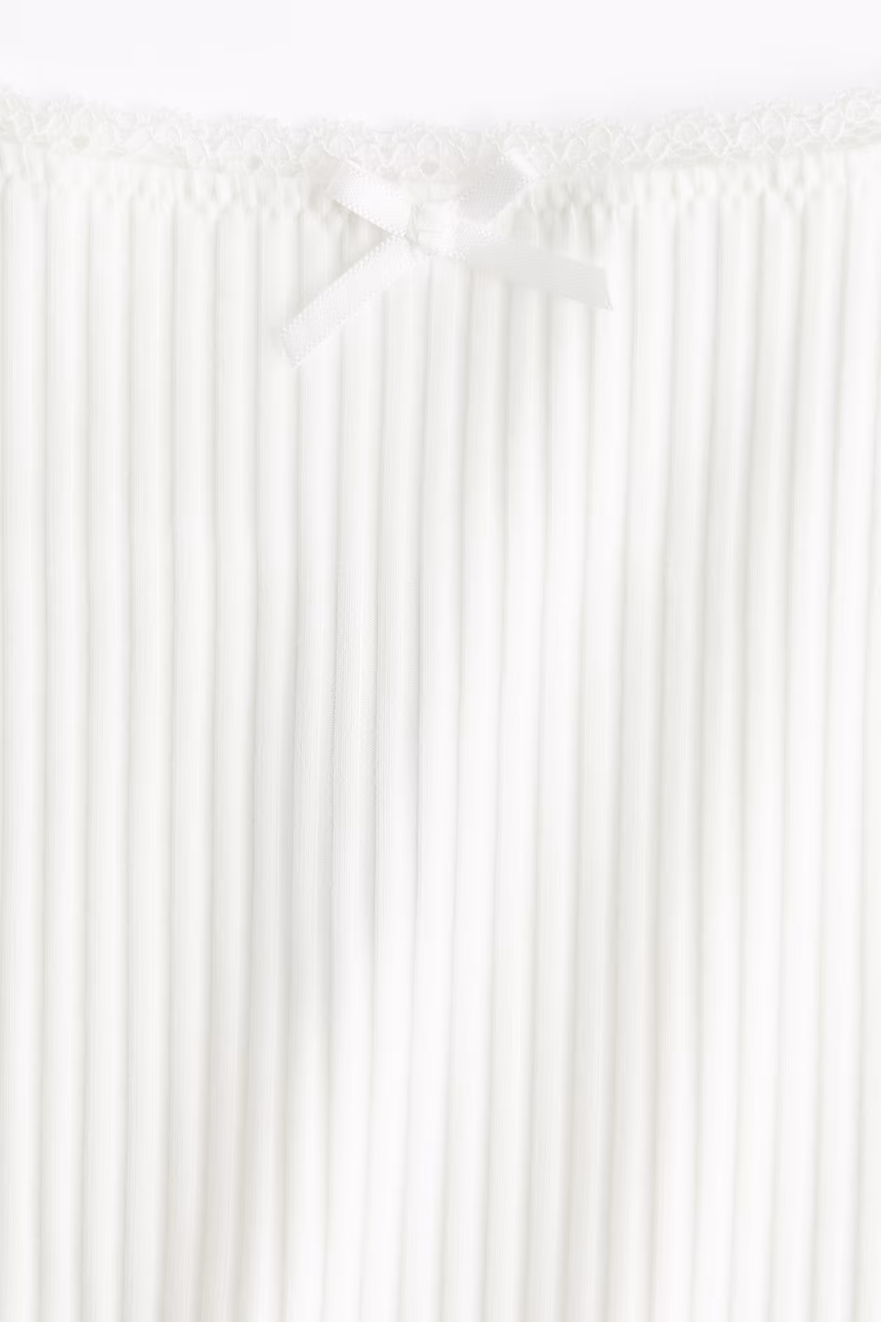 Fitted crop top in ribbed jersey. Narrow shoulder straps, a lace-trimmed neckline, and a small, decorative satin bow at front. Overlocked edge at hem.