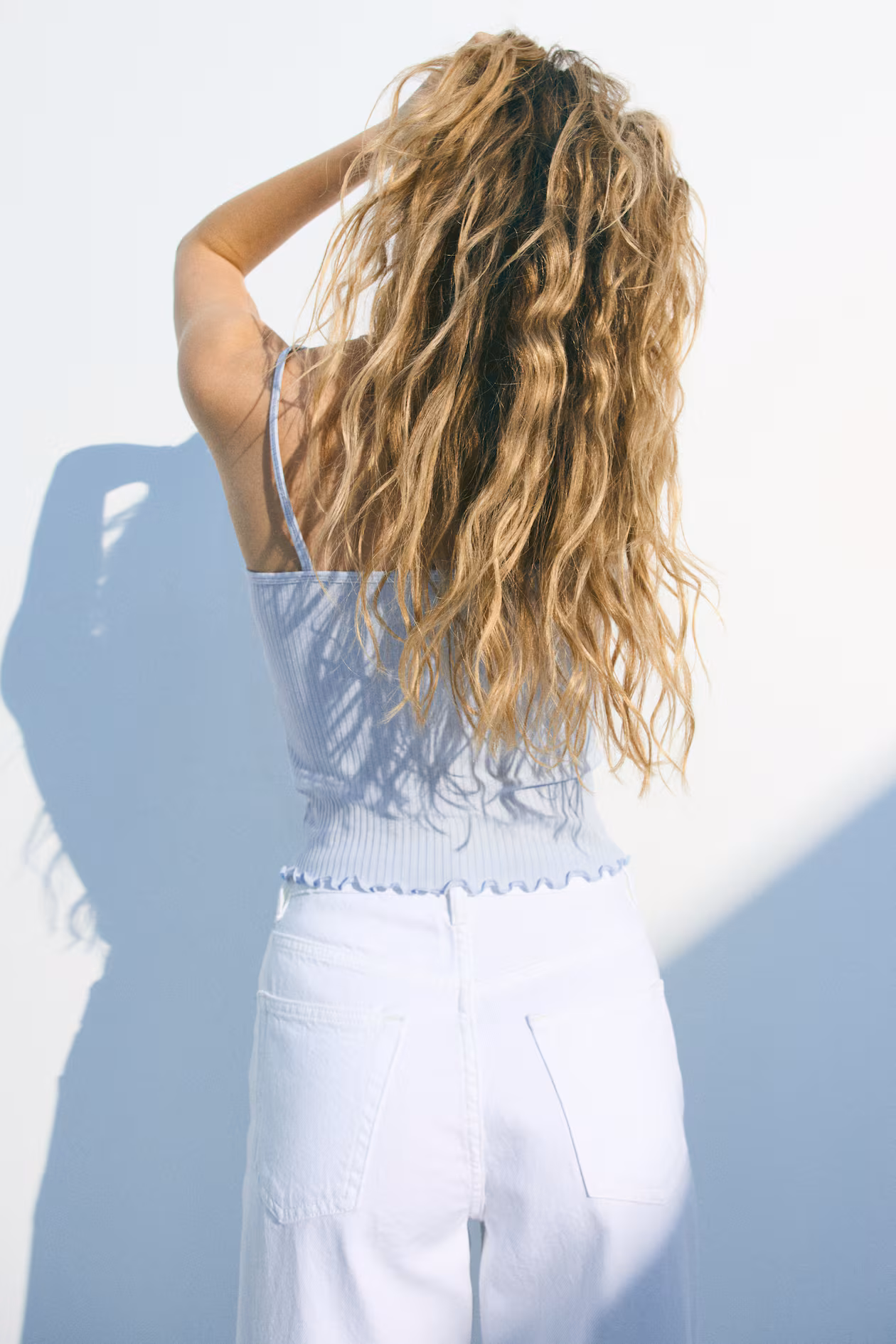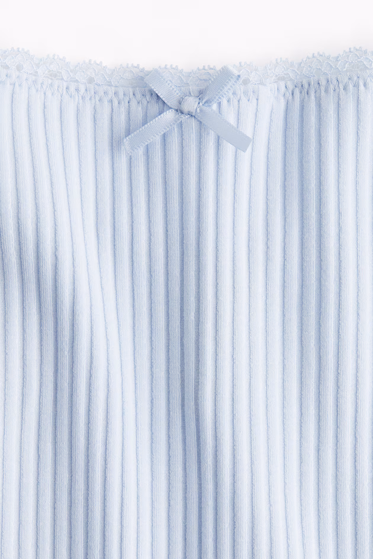 Fitted crop top in ribbed jersey. Narrow shoulder straps, a lace-trimmed neckline, and a small, decorative satin bow at front. Overlocked edge at hem.