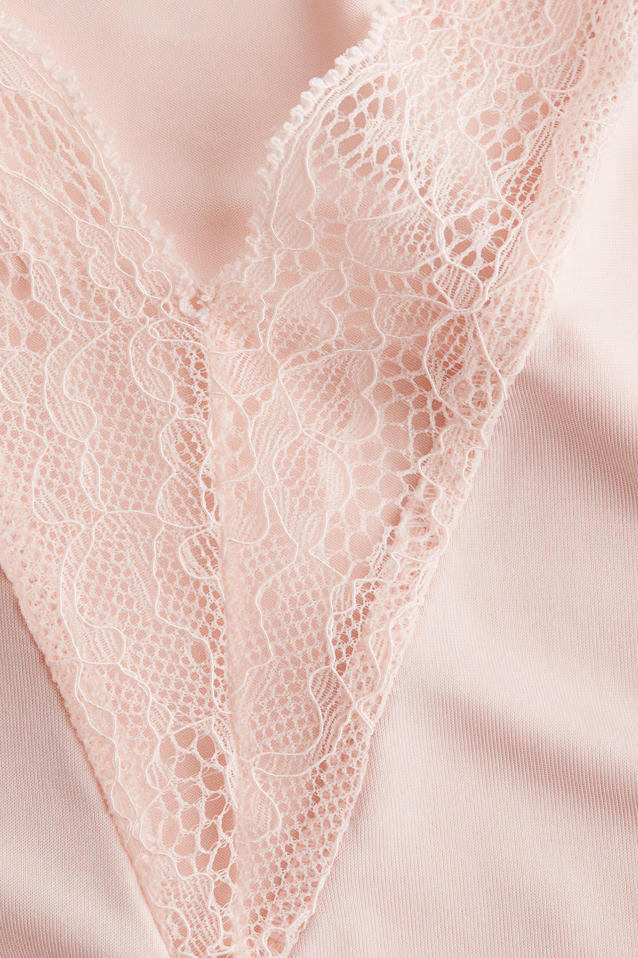 Sleeveless thong bodysuit in stretch jersey. Low-cut V-neck at front with delicate lace trim, gathers at sides for a draped effect, and concealed snap fasteners at gusset.