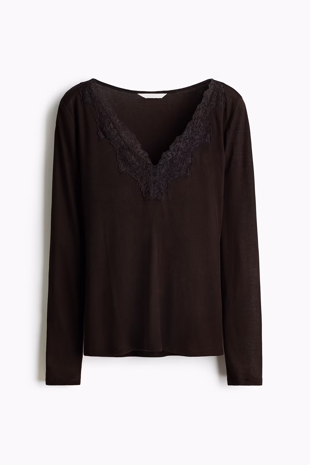 Fitted, long-sleeved top in ribbed jersey with a lace-trimmed V-neck at front.