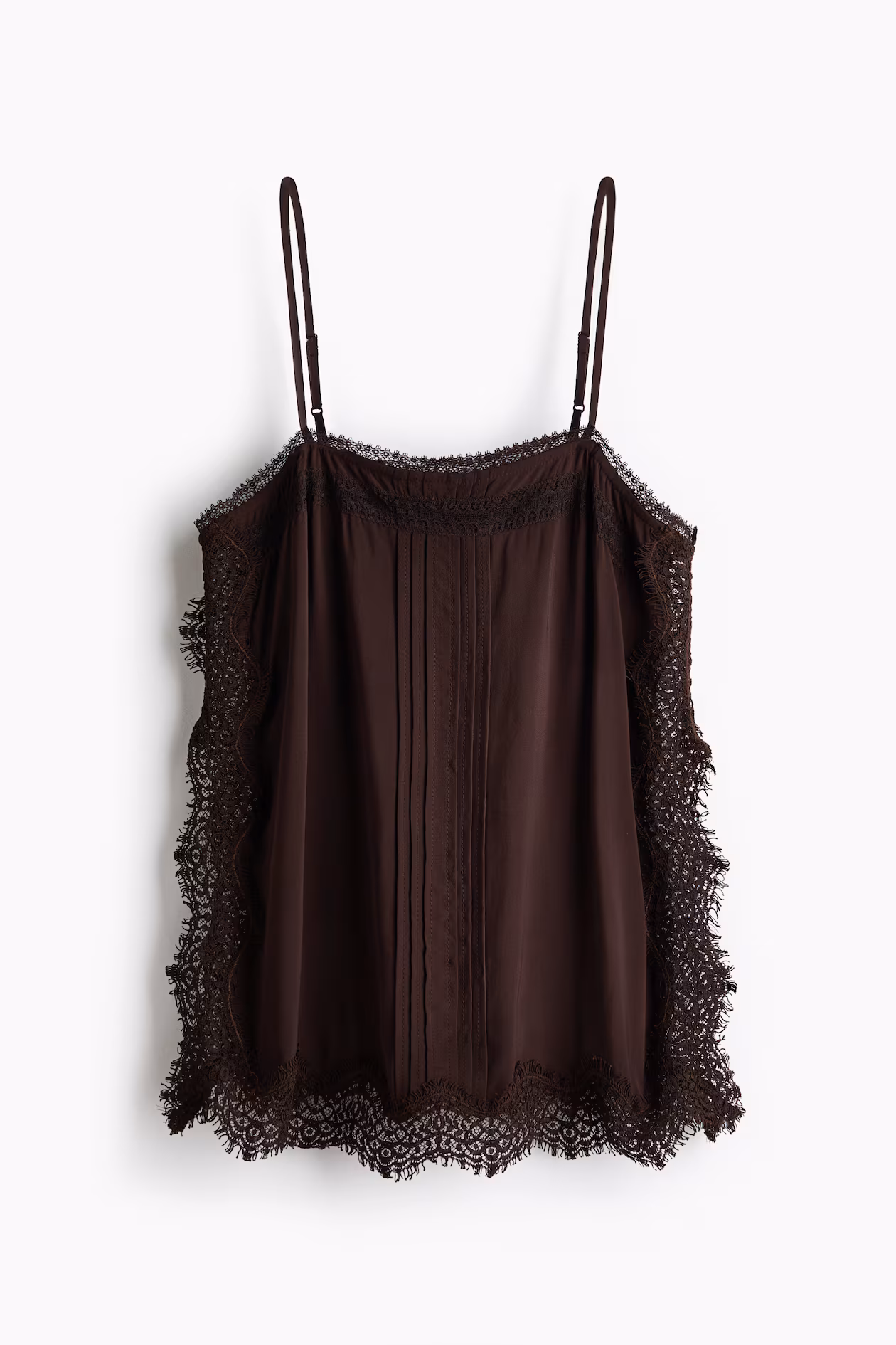 Fitted top in woven viscose with lace trim at top, along sides, and at hem. Narrow, adjustable shoulder straps, straight neckline, and pintucks at front.