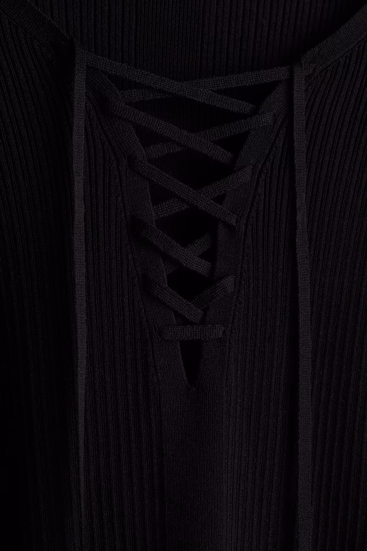 Fitted top in an irregular-shaped rib knit. Low-cut neckline, V-shaped opening at front with lacing, and long sleeves. Slit at cuffs.