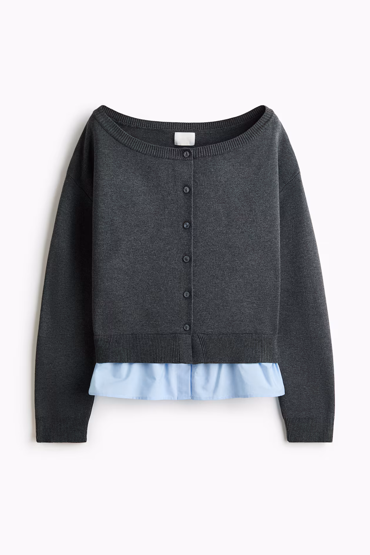 Short, off-the-shoulder cardigan in a soft knit. Buttons at front, dropped shoulders, and long sleeves. Ribbing at neckline, cuffs, and hem. Extended hem in woven cotton for a layered look.