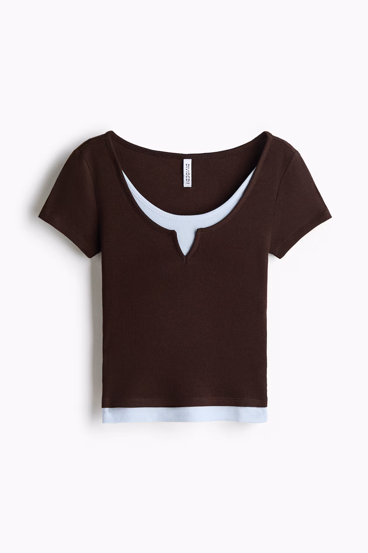 Fitted, short-sleeved top in ribbed cotton jersey with accent-color trim at neckline and hem for a layered look. Scoop neck with a small, V-shaped opening on outer layer.