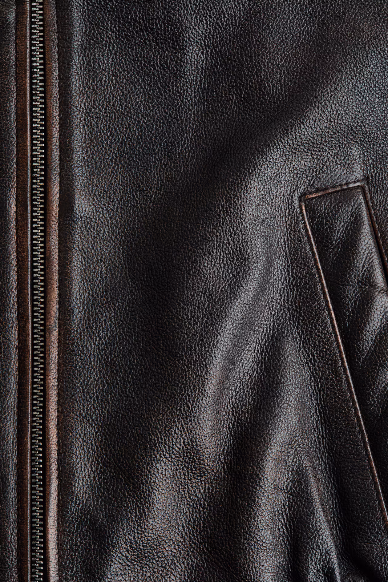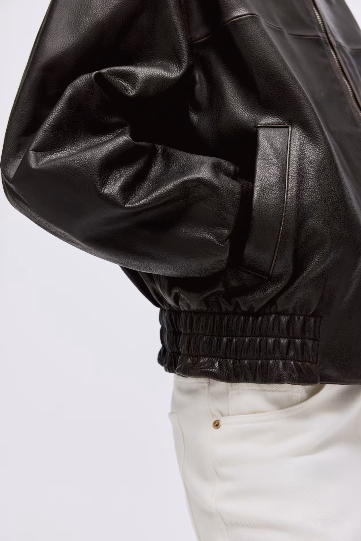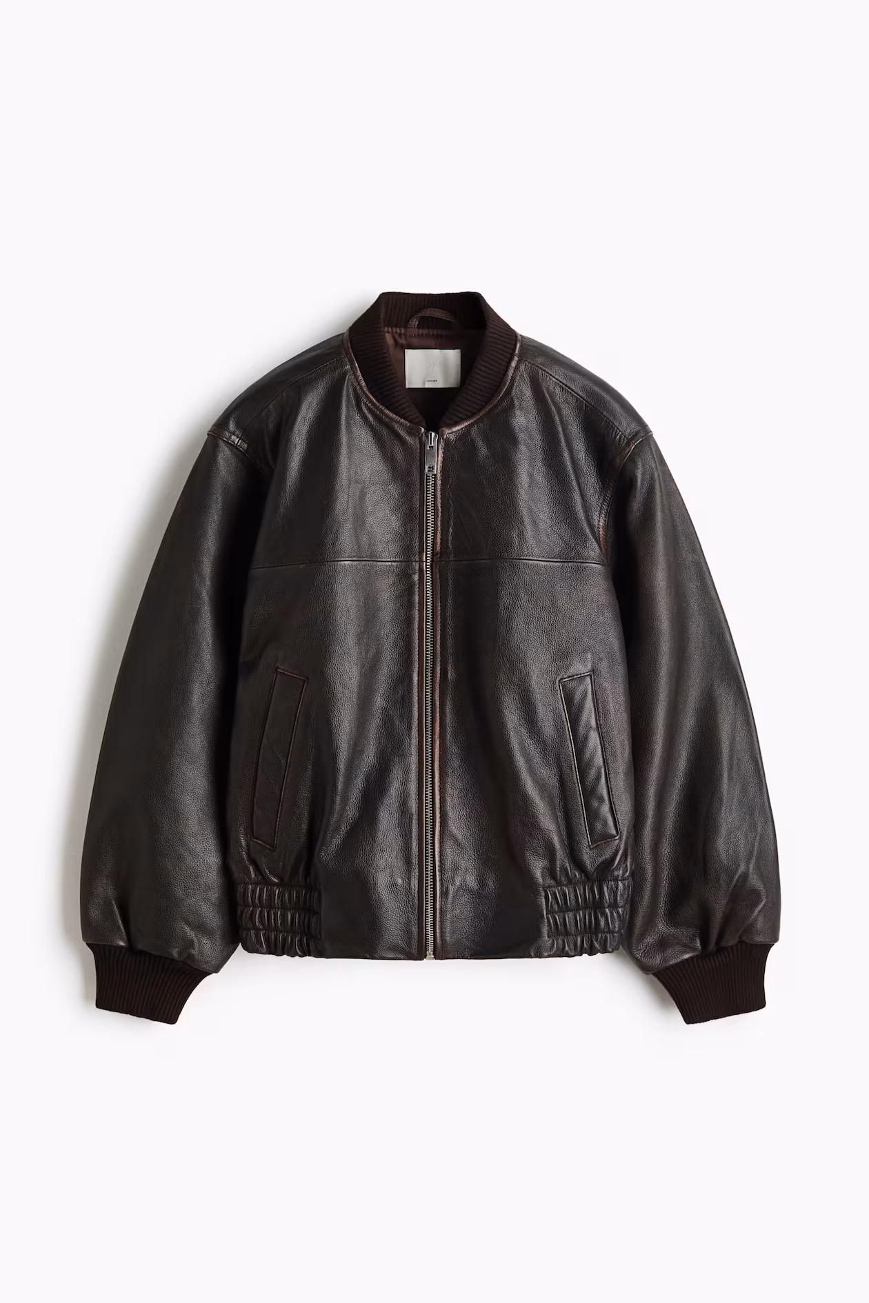 Oversized jacket in distressed-look leather. Ribbed stand-up collar, zipper at front, and welt side pockets. Ribbing at cuffs and smocked elastic at hem. Lined.