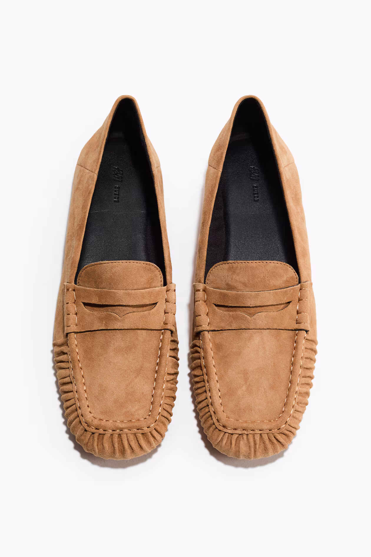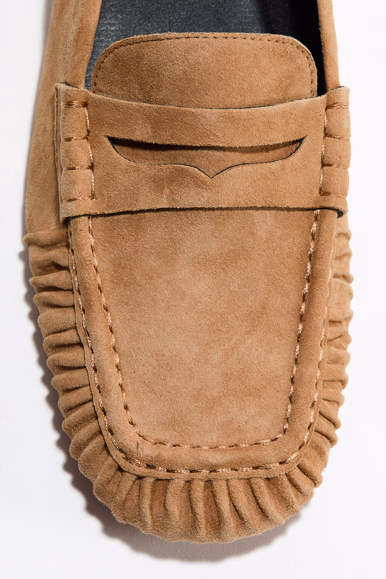 Loafers in soft leather with a penny keeper and a moccasin seam at front with gathers. Jersey lining and leather insoles.