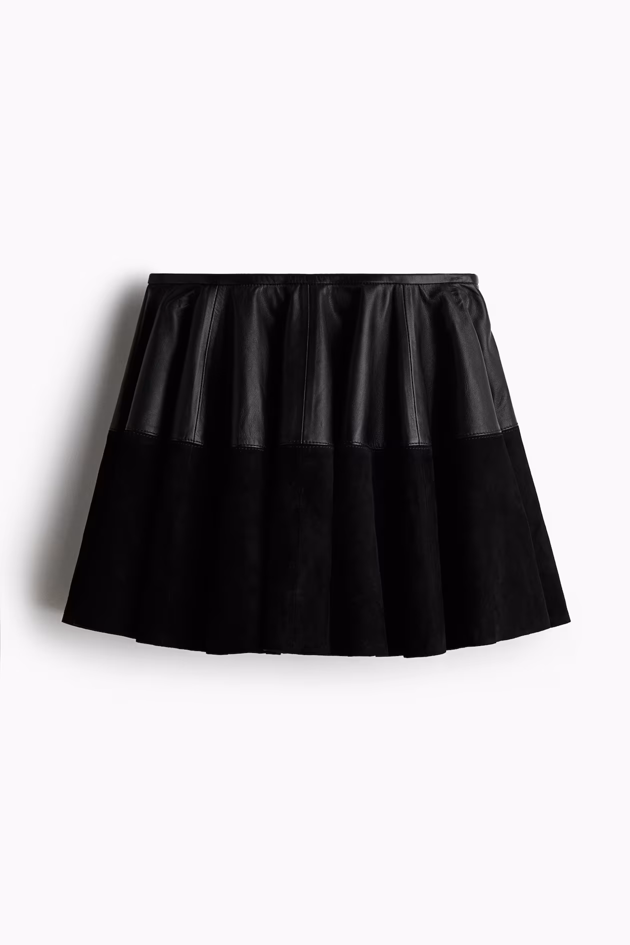 Mini circle skirt in soft leather with suede panel at lower section. Regular waist, narrow binding at waistband, and a concealed zipper at one side with hook-and-eye fastener. Unlined.