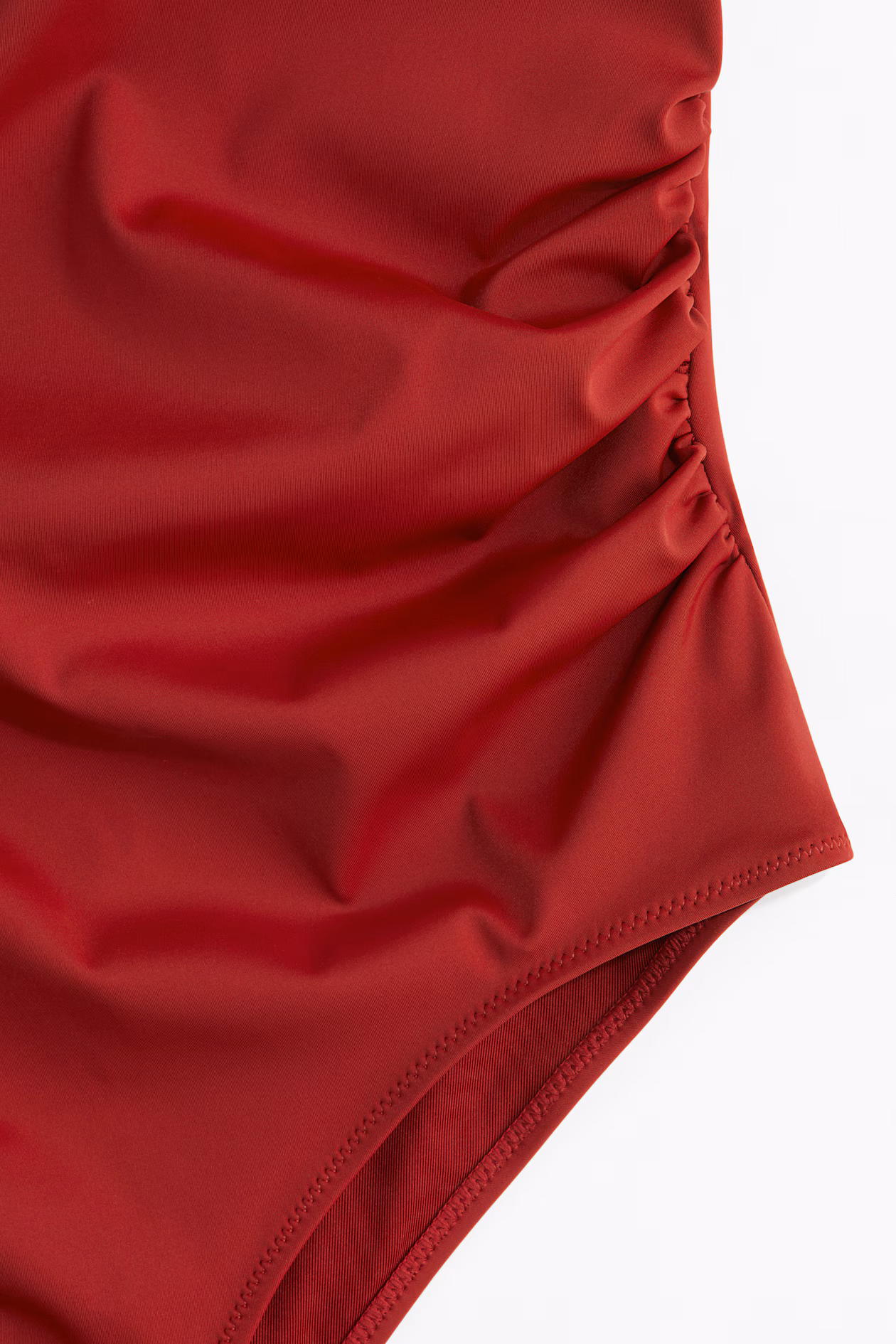 Fully lined, one-shoulder swimsuit. Snug fit with a light shaping effect on waist. Asymmetric neckline with one wide shoulder strap, cups with removable inserts for shaping and good support, and gathers at one side of waist for a gently draped effect. Medium coverage at back.