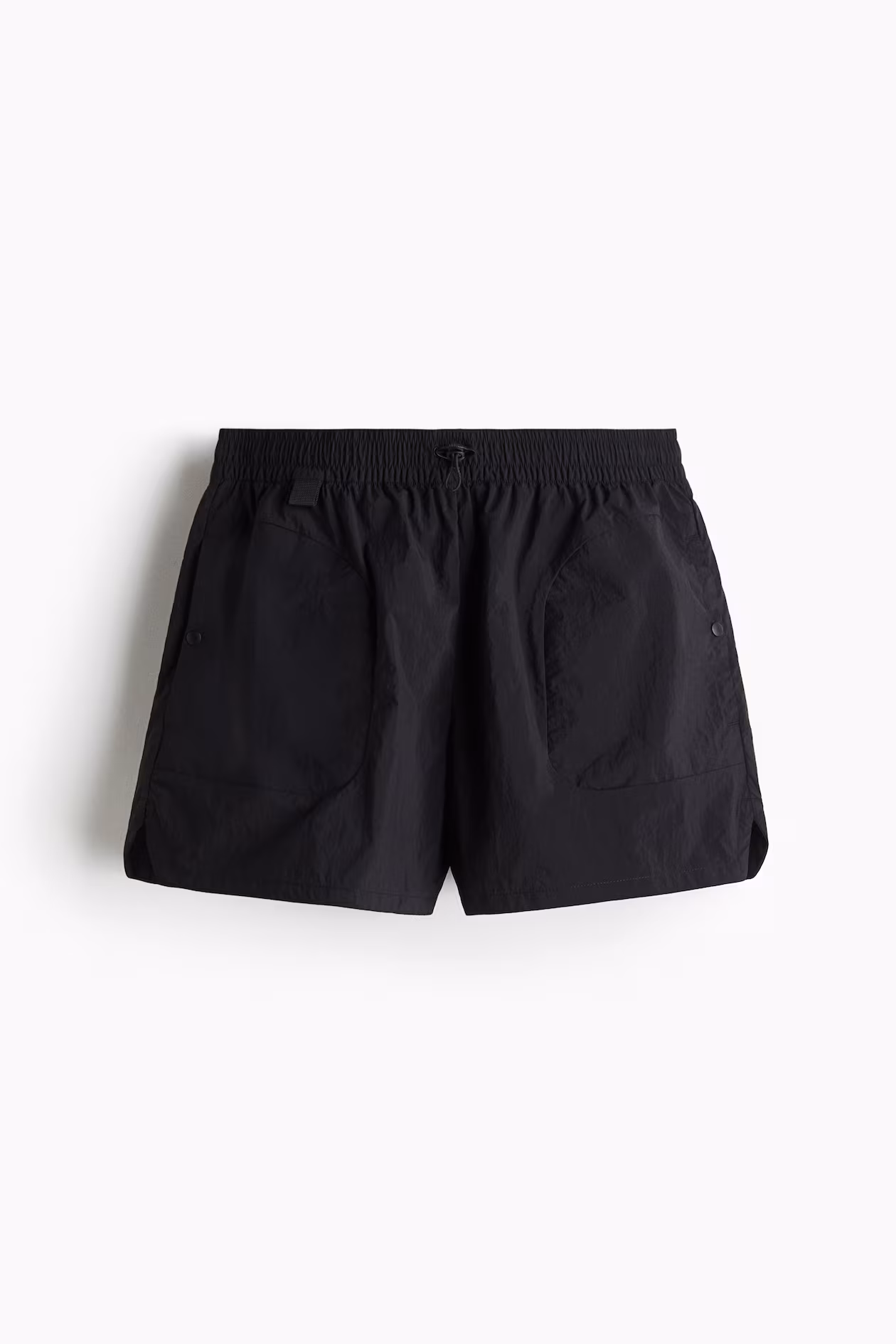 Loose-fit, lightweight outdoor shorts in wind-resistant, water-repellent functional fabric designed for light showers and protection from wind. Waistband with smocked elastic and an elastic drawstring with cord stopper. Side pockets with snap fastener and an additional, discreet side pocket with zipper. Webbing loop at front for attaching a carabiner hook. Slit at side of hems for ease of movement.