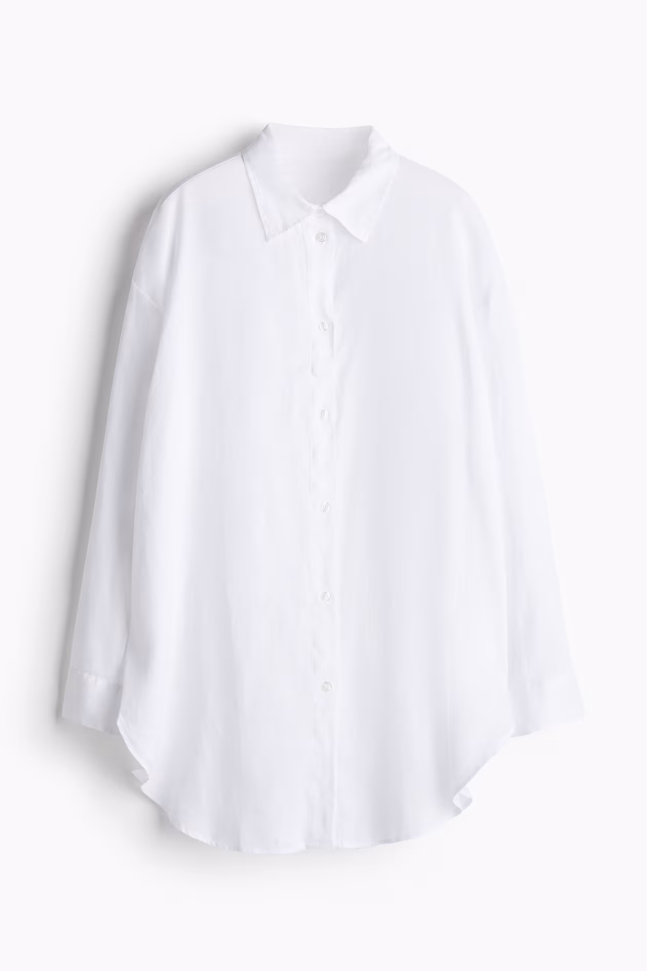Long, loose-fit shirt in airy, woven linen fabric. Collar, buttons at front, dropped shoulders, and long sleeves with button at cuffs. Rounded hem.