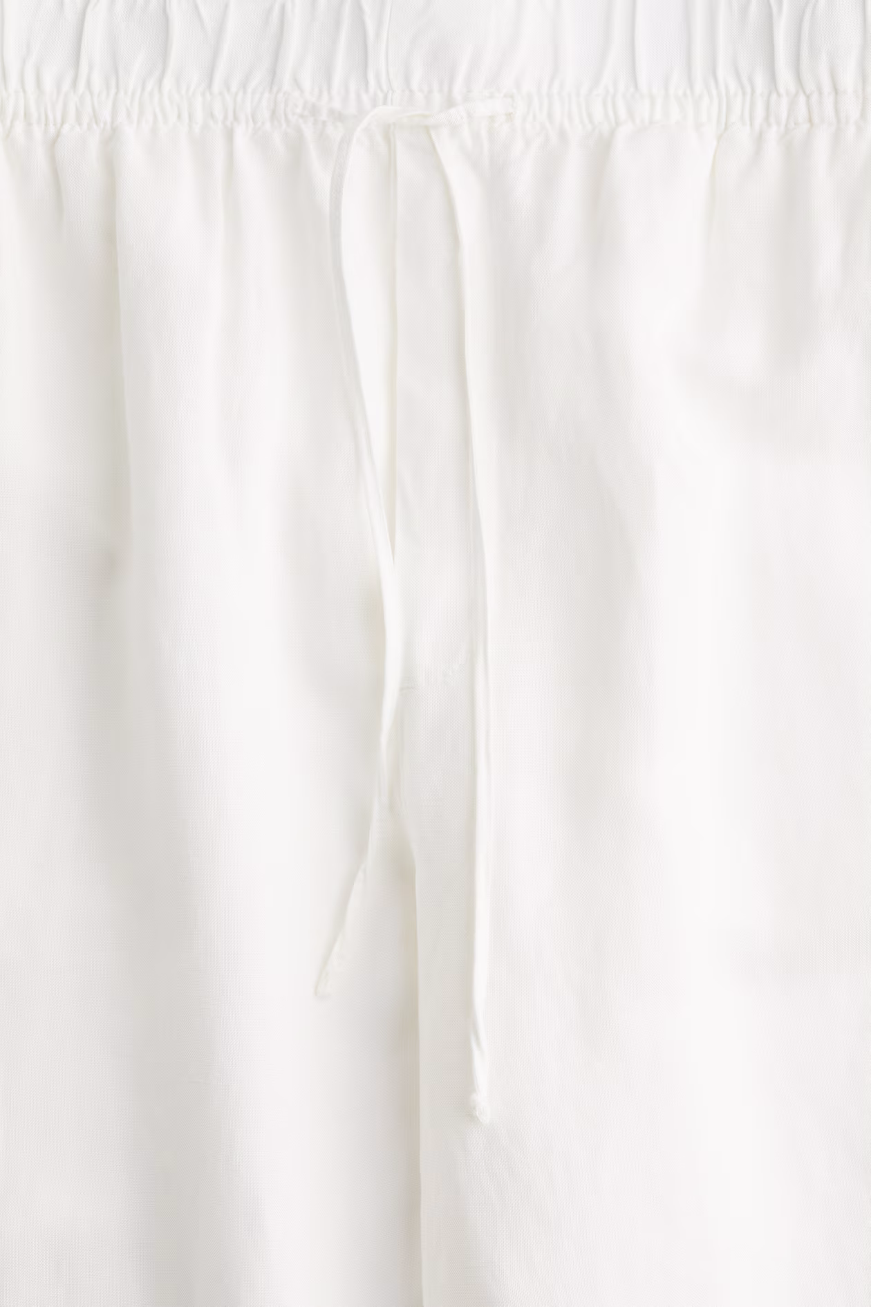 Loose-fit, ankle-length pants in a woven linen and viscose blend. High waist, narrow drawstring and covered elastic at waistband, and diagonal side pockets. Tapered legs.