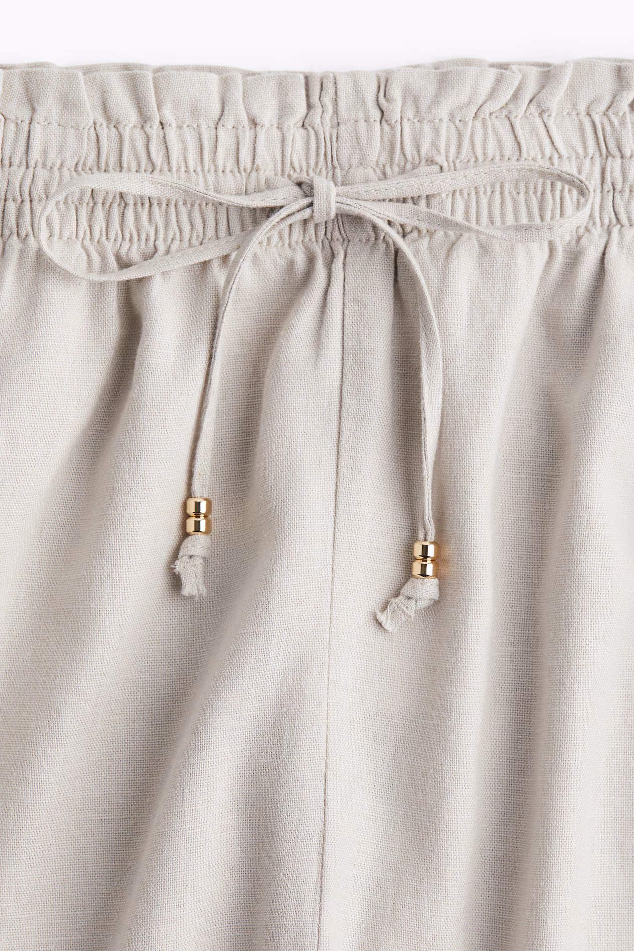 Loose-fit shorts in an airy, woven linen and viscose blend. High waist and ruffle-trimmed waistband with smocked elastic and a narrow drawstring with metal beads. Discreet side pockets.