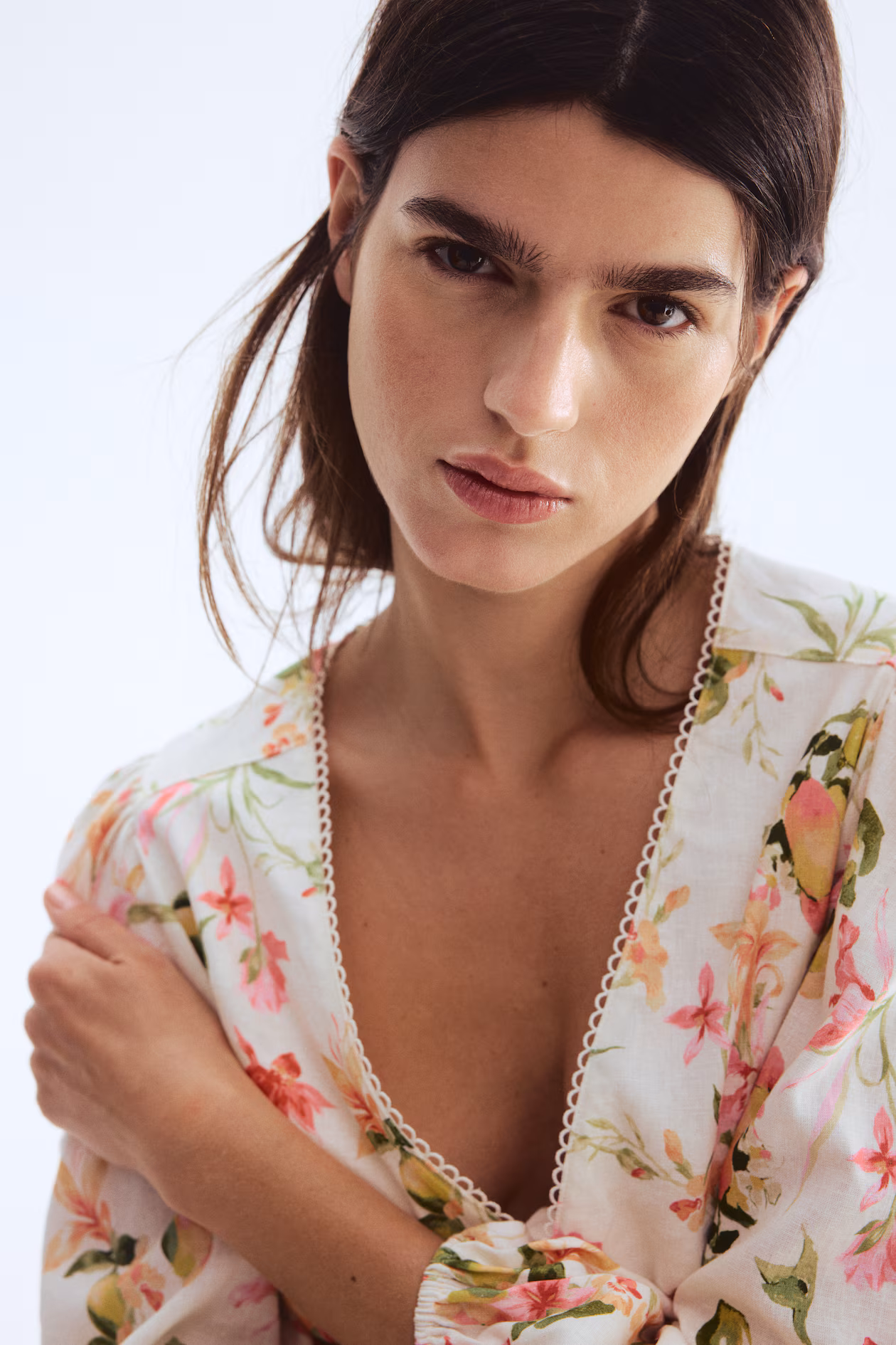 Short fitted dress in an airy woven linen and viscose blend. Picot-trimmed low-cut V-neck, covered buttons at front, and a gathered seam below bust. 3/4-length balloon sleeves with narrow elastic at cuffs. Cotton lining.