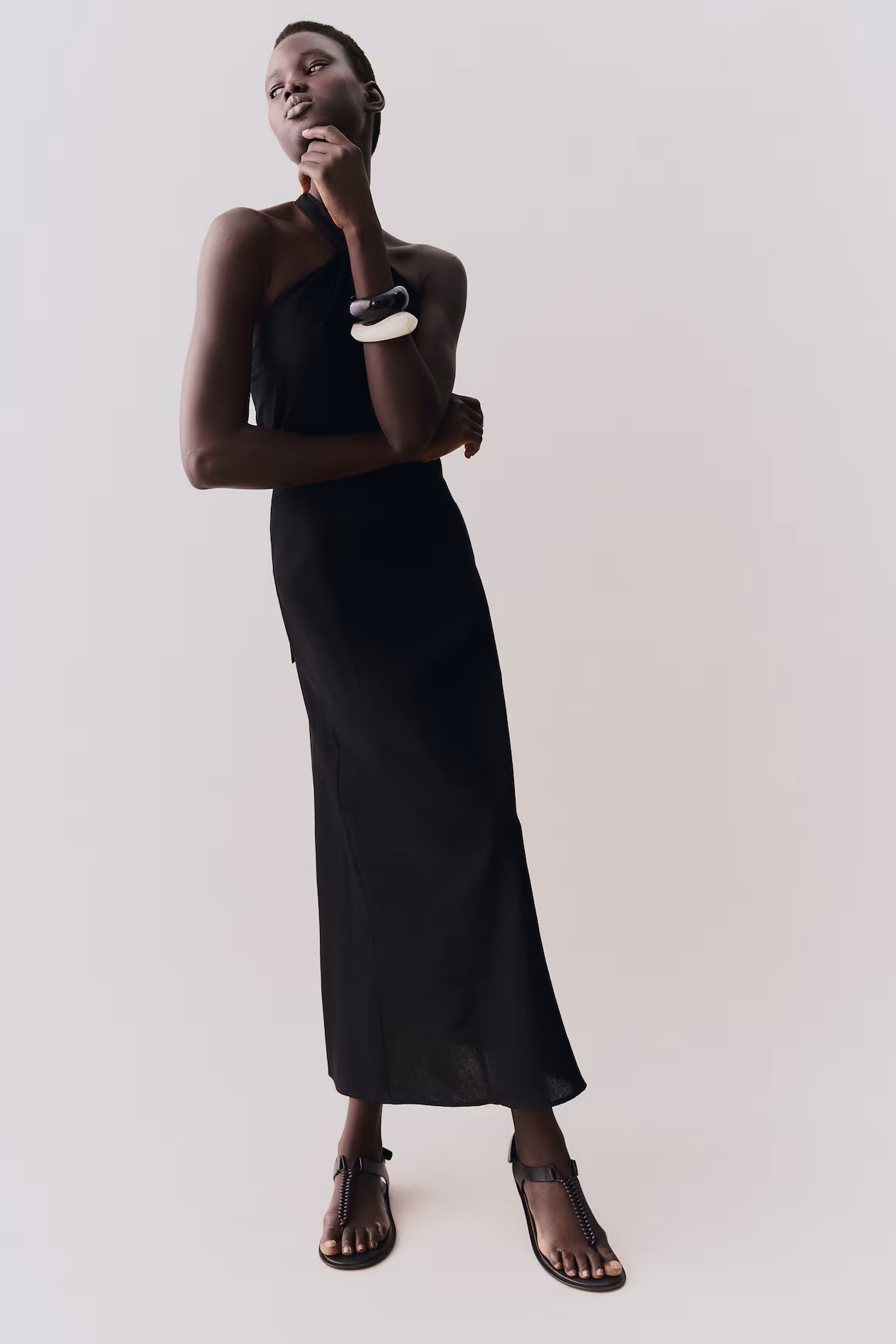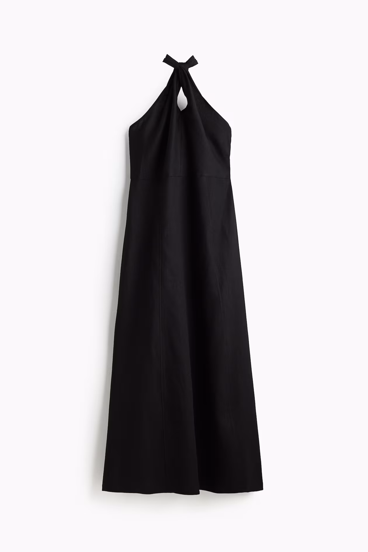 Calf-length dress in a woven linen and viscose blend. Halterneck strap threaded through a twisted section at front to tie at back. Fitted bodice, concealed zipper at one side with hook-and-eye fastener, and a seam at waist. Gently flared skirt with visible, vertical seams at front and back. Unlined.