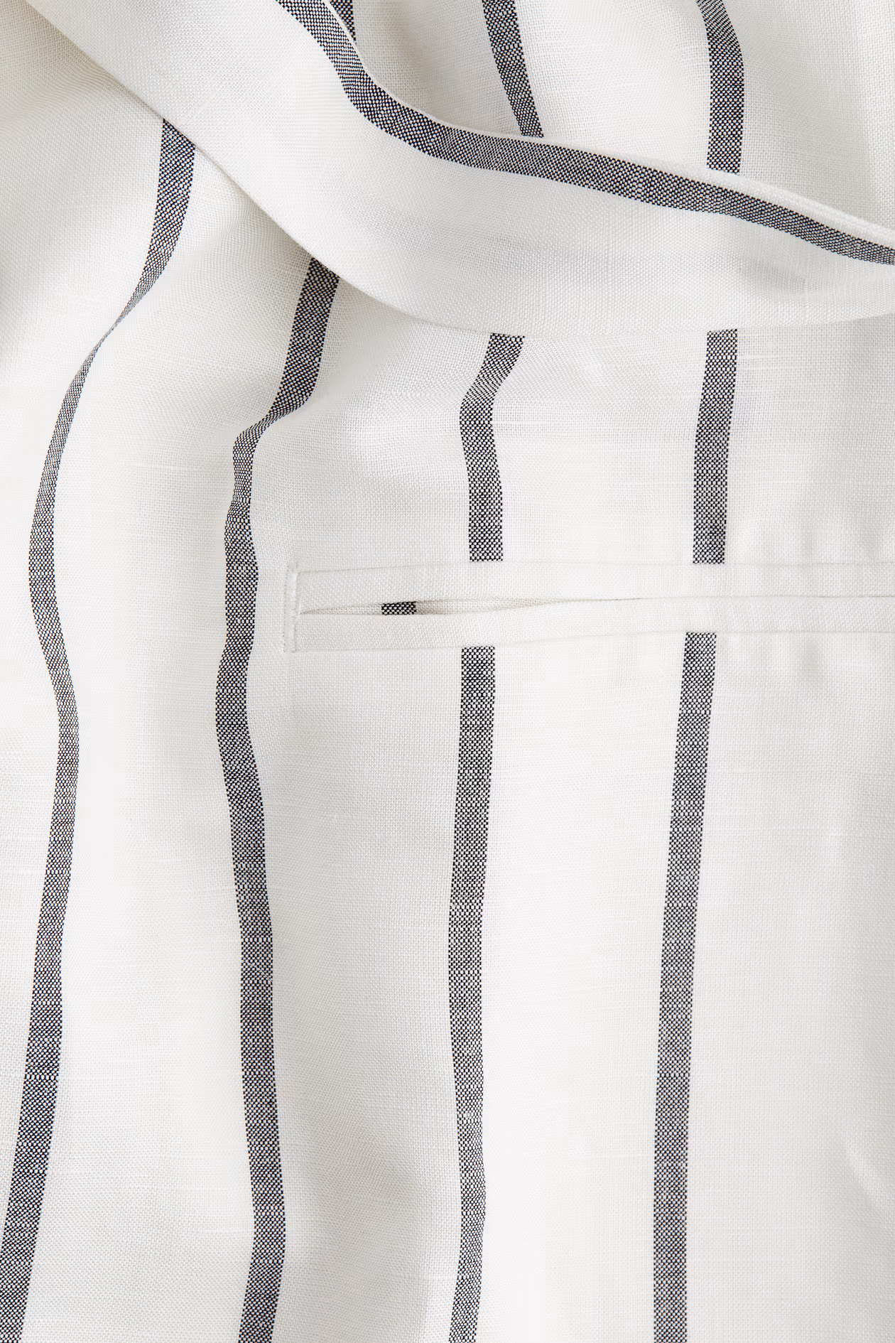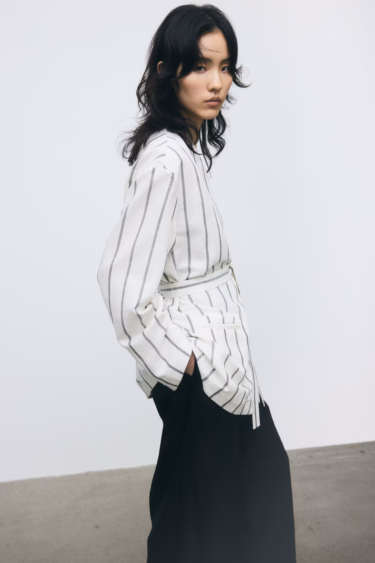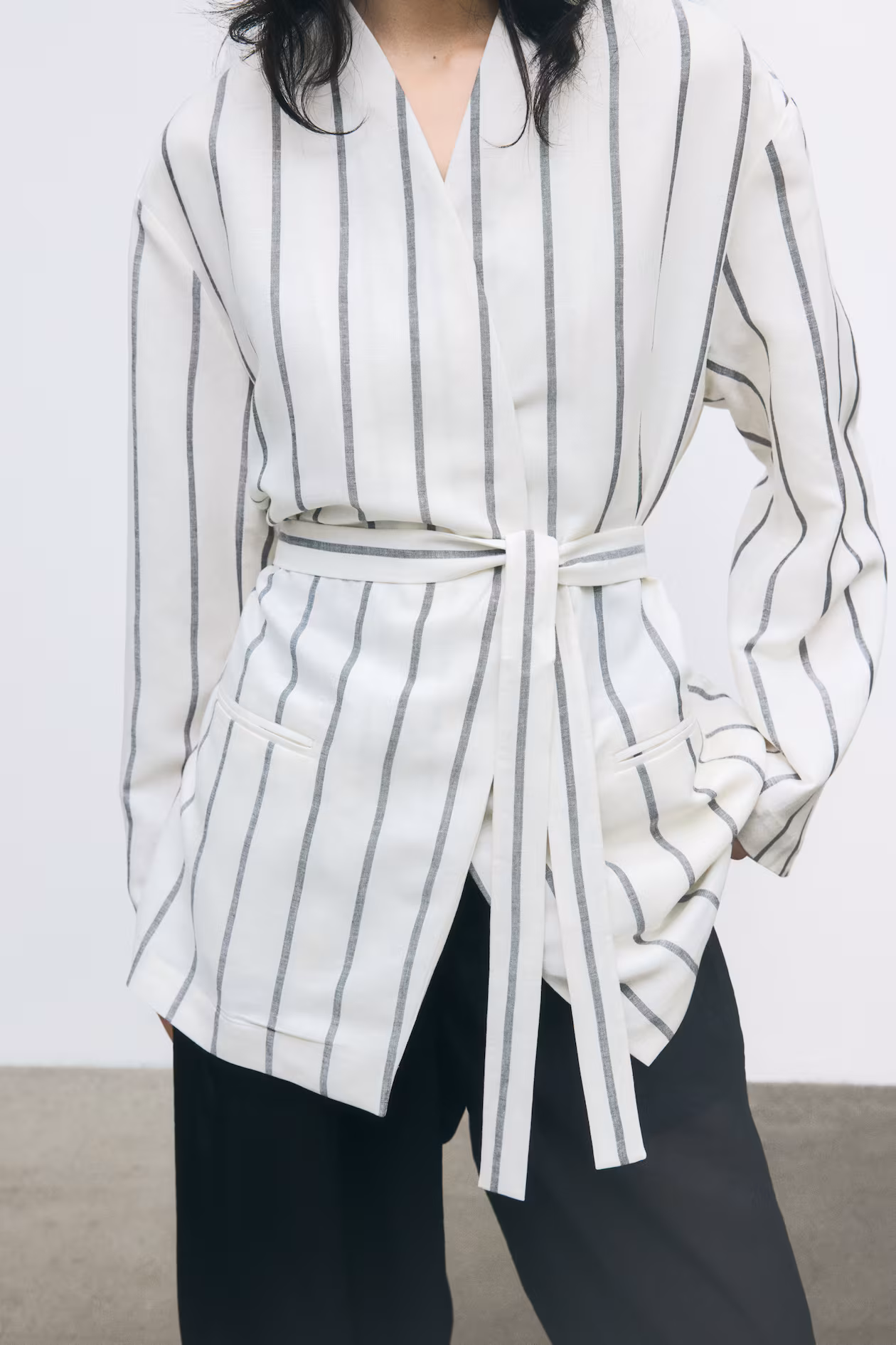 Oversized jacket in a woven linen and viscose blend. Lapelless neckline, open front, welt front pockets, and a removable tie belt at waist. Gently dropped shoulders and long sleeves with a slit at cuffs. Partly lined.