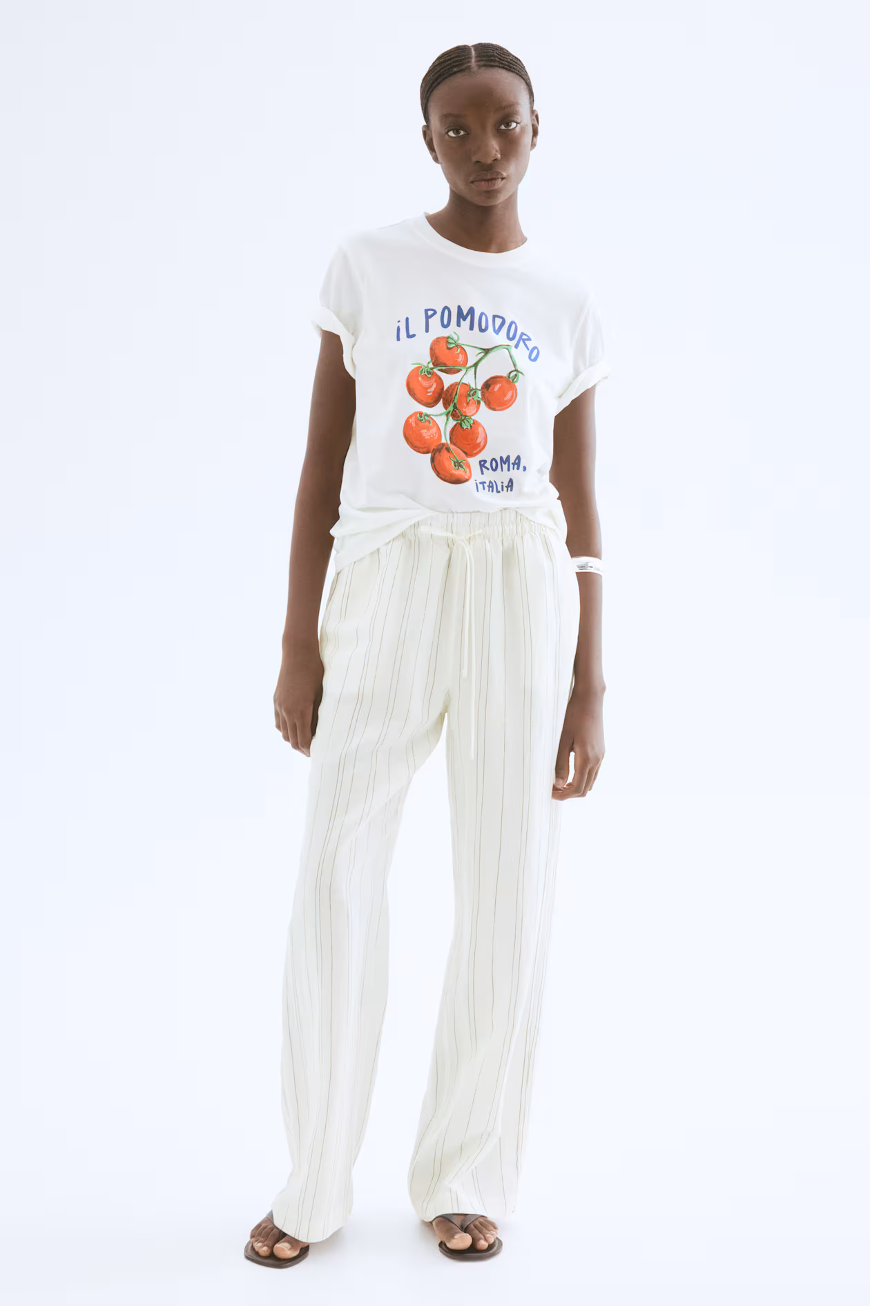 Loose-fit pants in an airy, woven linen blend. High waist, elasticized waistband with narrow drawstring, and discreet side pockets. Straight legs.