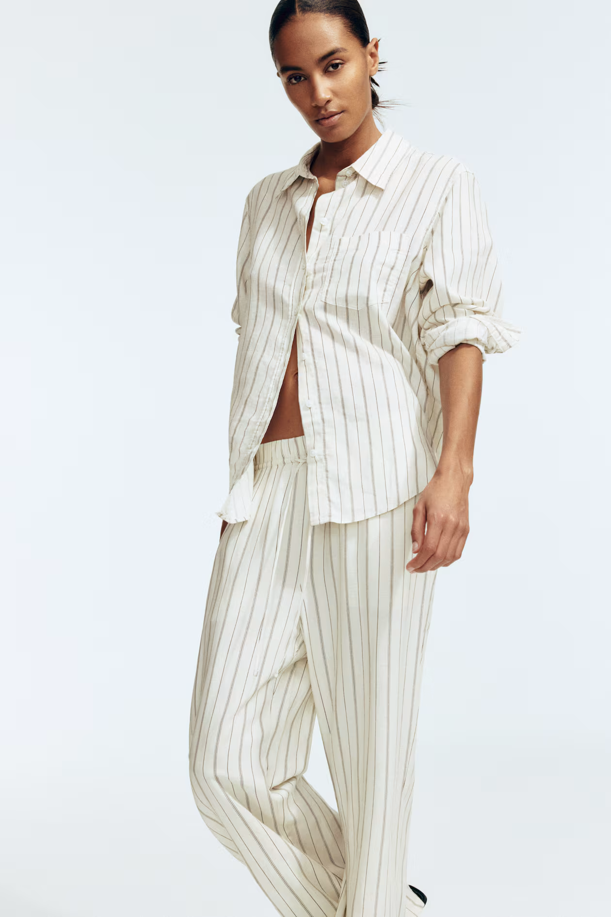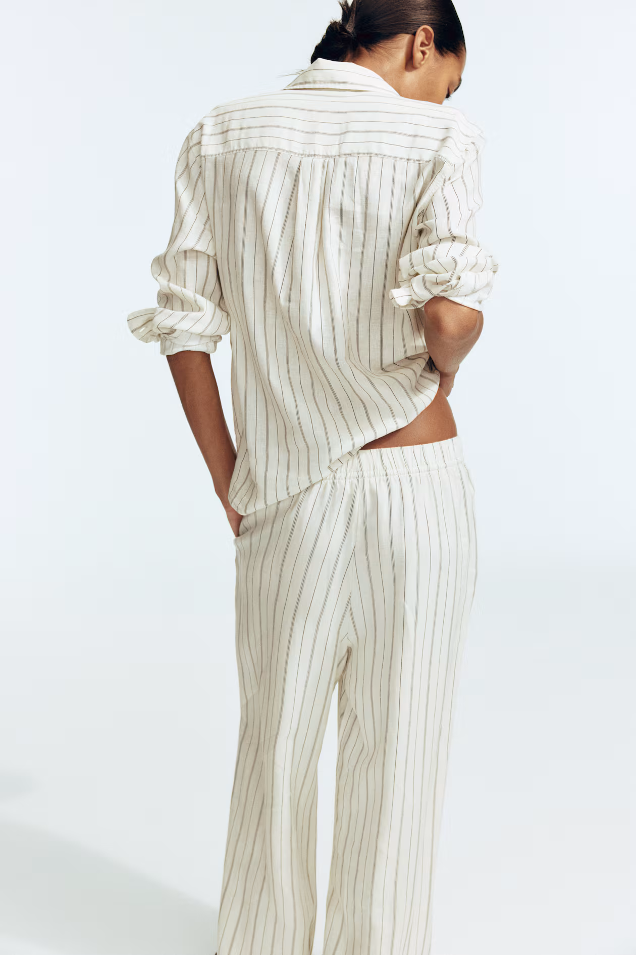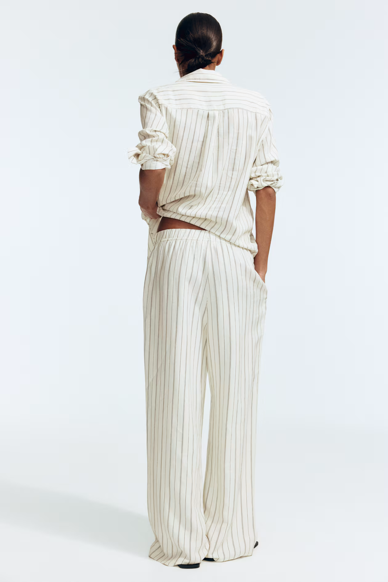 Loose-fit pants in an airy, woven linen and viscose blend. High waist, elasticized waistband with narrow drawstring, and discreet side pockets. Straight legs.