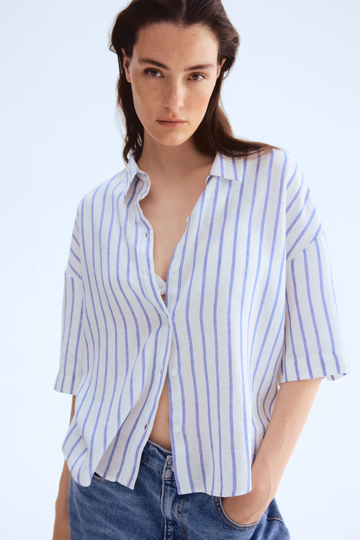 Loose-fit shirt in an airy, woven linen and viscose blend. Collar, buttons at front, and an inverted box pleat at back. Heavily dropped shoulders, elbow-length sleeves, and a gently curved hem.