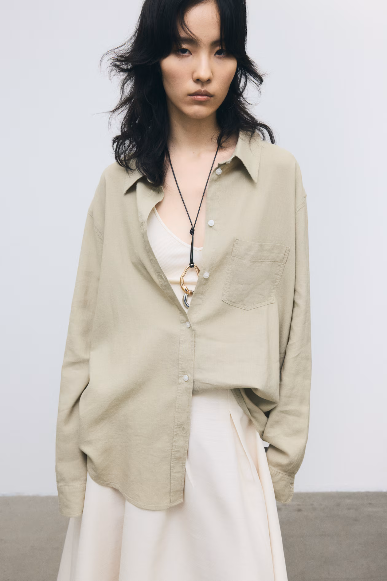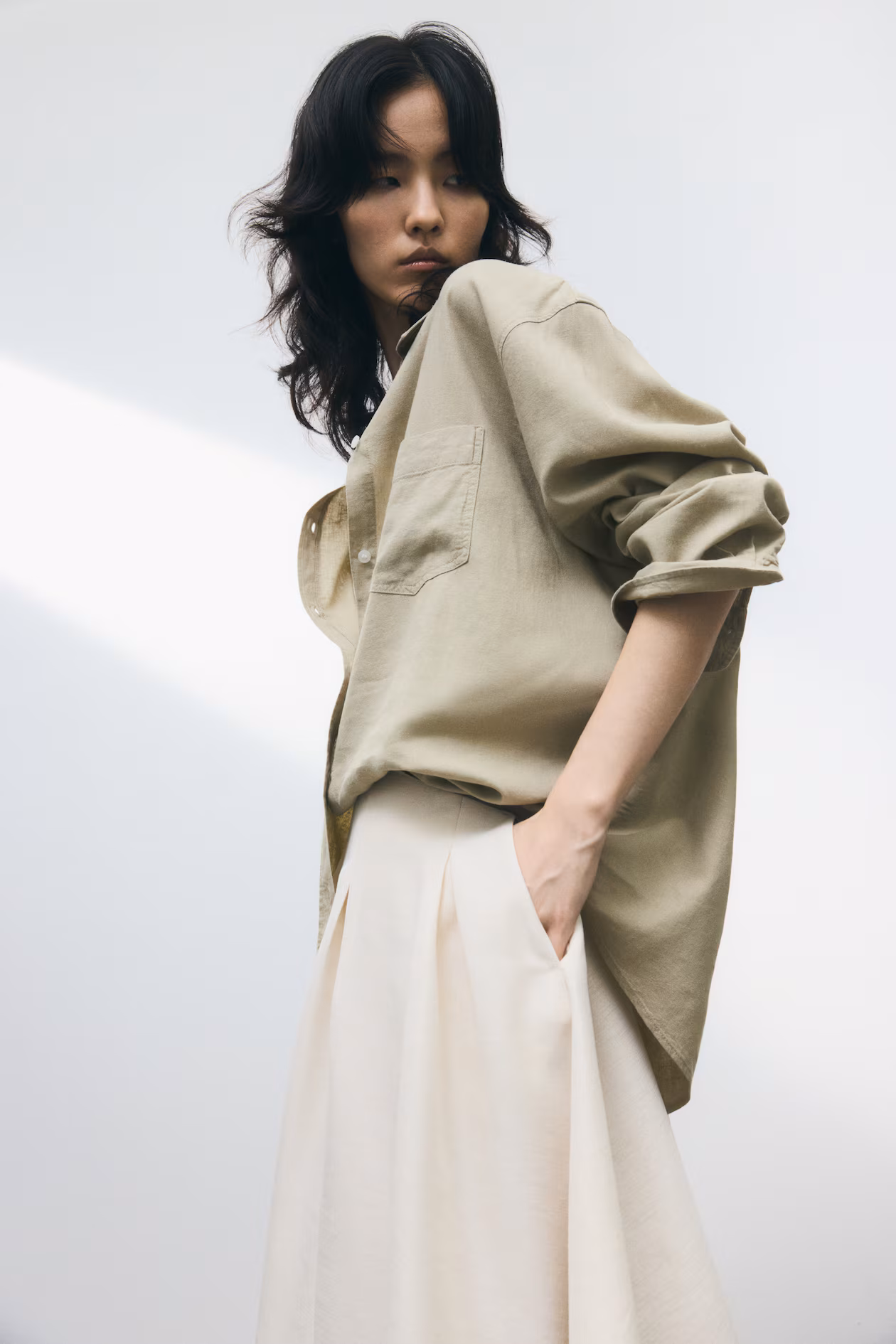 Shirt in an airy, woven linen and viscose blend. Collar, buttons at front, an open chest pocket, and a double-layered yoke at back with box pleat. Long sleeves with button at cuffs. Rounded hem.