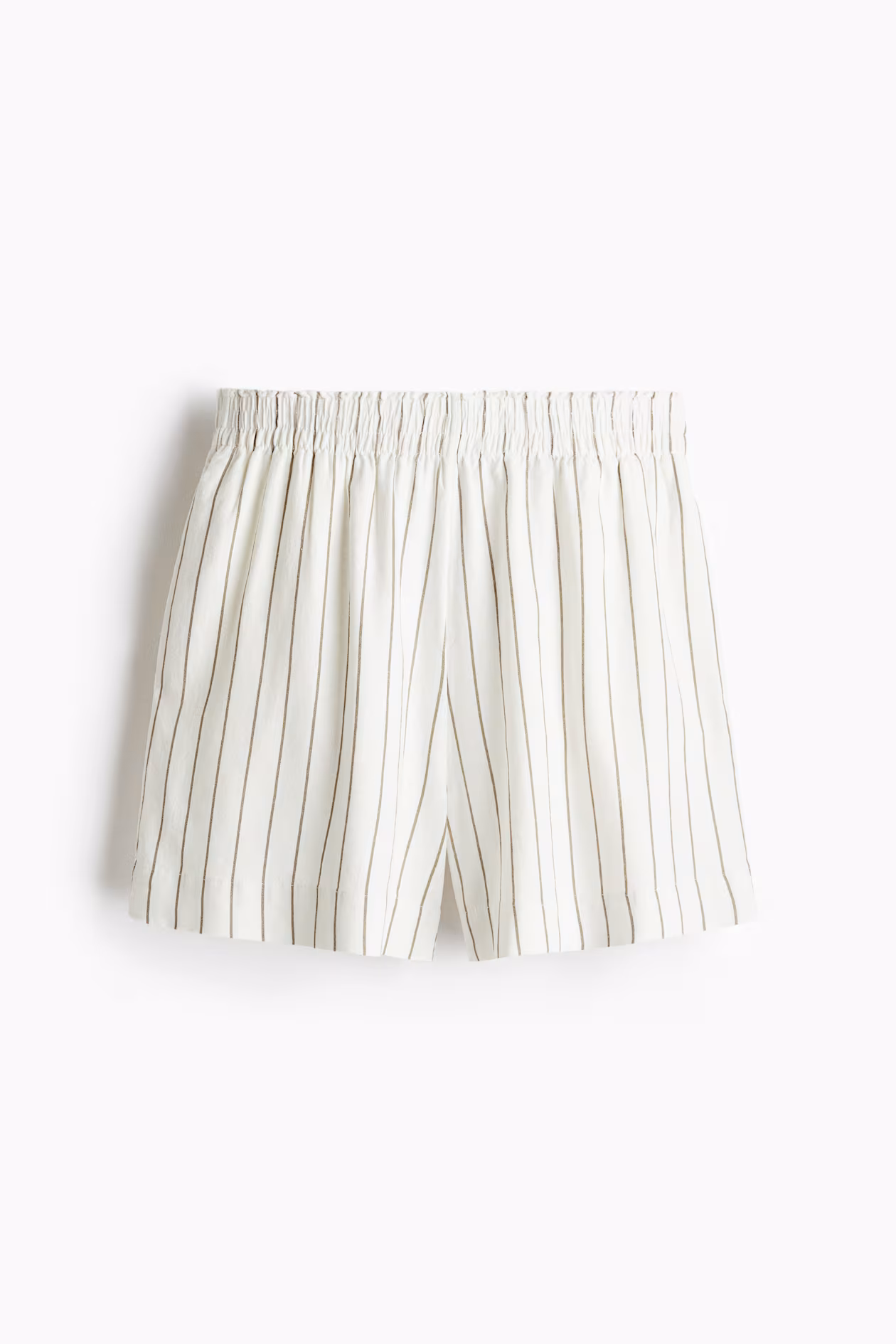 Loose-fit shorts in a woven linen blend. High waist, smocked elastic at waistband, and discreet side pockets.