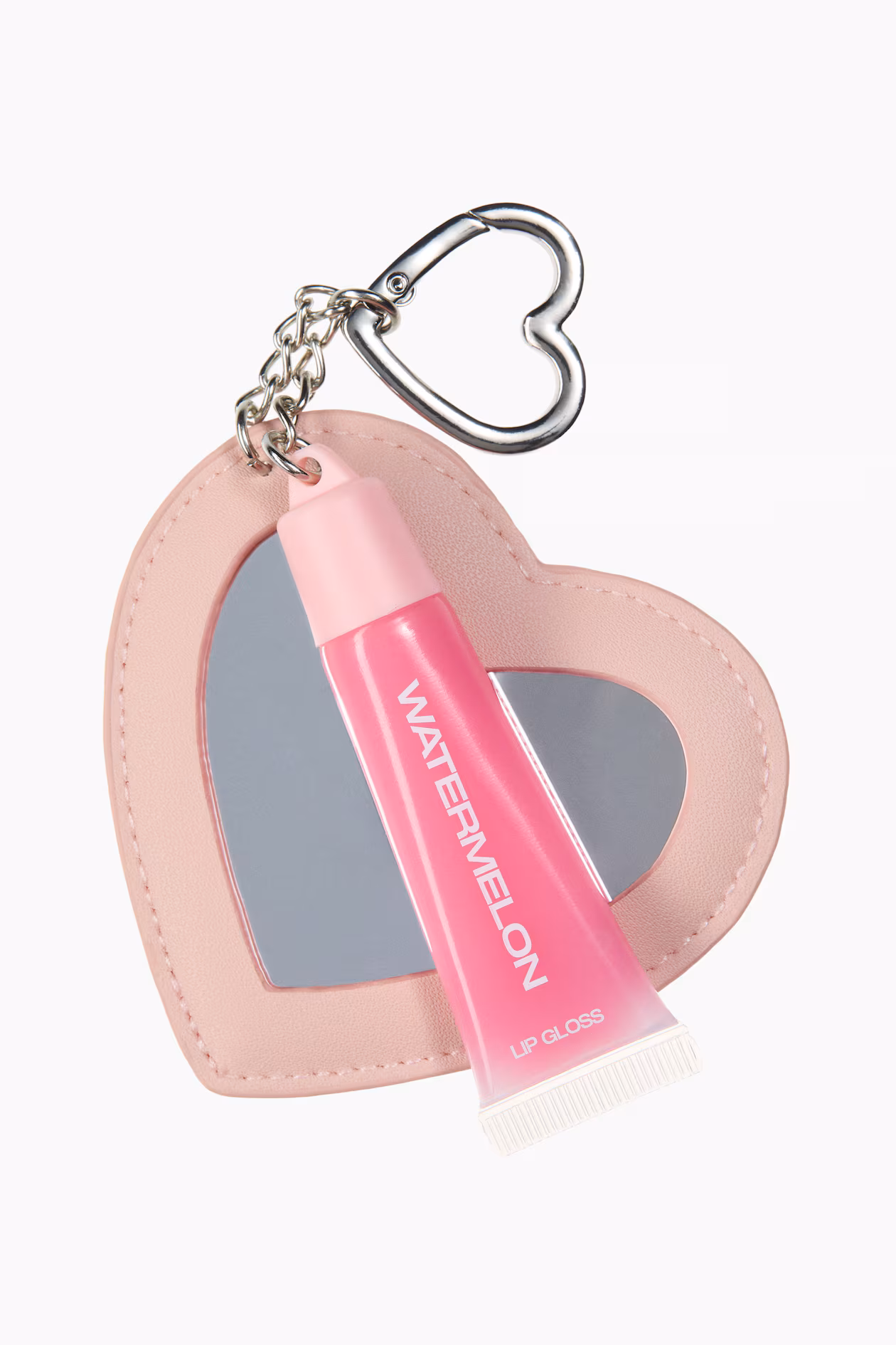 Watermelon-scented lip gloss in a milky pink shade that delivers a glossy finish while keeping lips perfectly moisturized. It comes with a small, heart-shaped mirror and matching heart-shaped carabiner hook for easily attaching the key ring for on-the-go touch-ups. Vegan. 0.25 fl. oz.